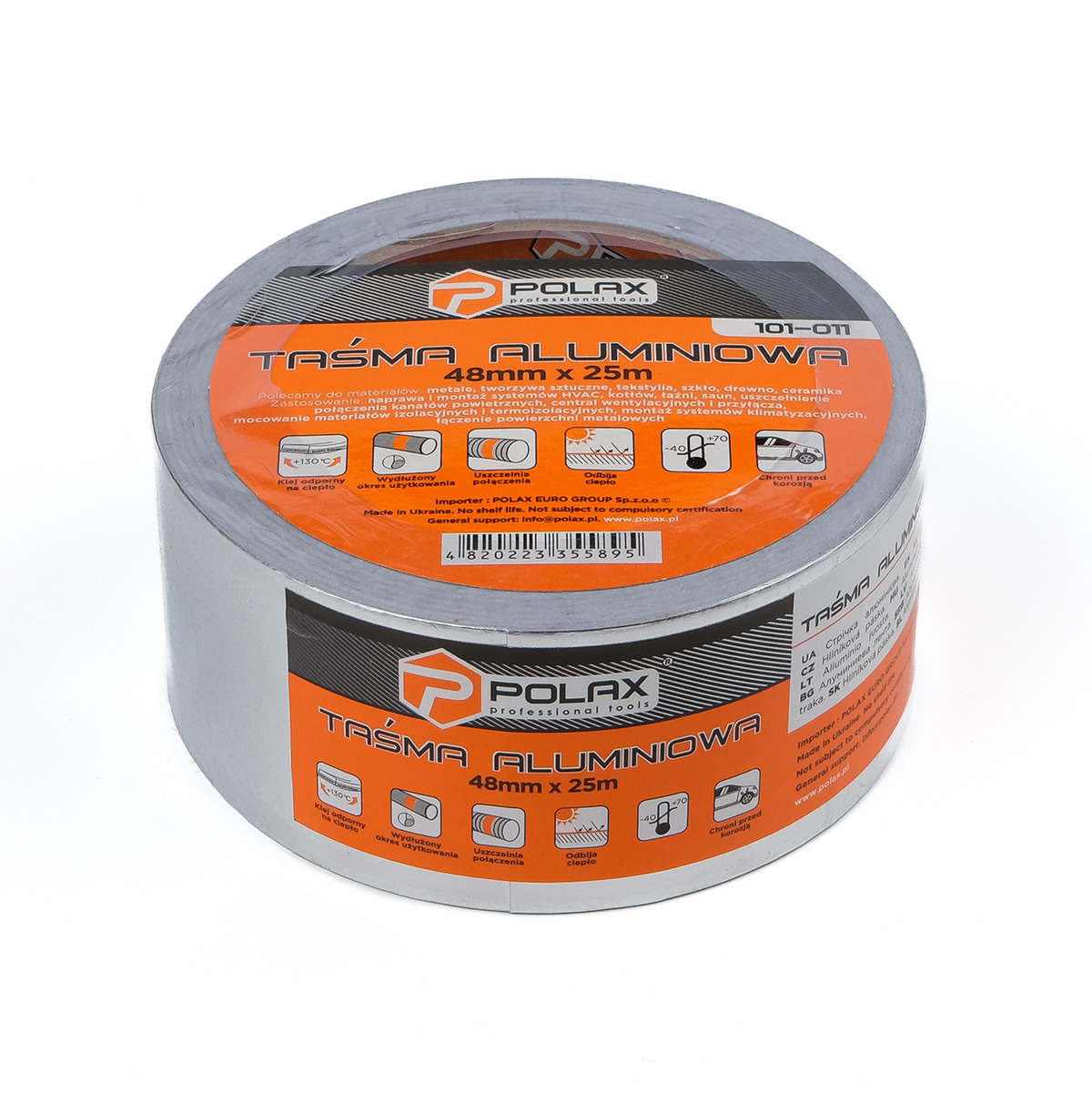 Taśma aluminiowa żaroodporna stosowana jest w budownictwie i działalności gospodarczej do prac instalacyjnych, hydroizolacyjnych i termoizolacyjnych: izolacja rurociągów, wentylacji, zbiorników i armatury w instalacjach ciepłowniczych i wodociągowych, montaż kanałów wentylacyjnych, montaż izolacji cieplnych ze stali, rury ocynkowane, żeliwne, plastikowe, miedziane i do innych celów. Taśma aluminiowa żaroodporna składa się z folii aluminiowej z warstwą kleju i ochronnego podłoża papierowego. Metalowa powierzchnia lustra charakteryzuje się wysokim stopniem odbicia promieni podczerwonych i ultrafioletowych, co pozwala na wykorzystanie tego typu taśm do celów termoizolacyjnych. Stosując żaroodporną taśmę aluminiową, można ograniczyć straty ciepła powstałe na skutek nieszczelności połączeń i szwów. Materiał ten stanowi doskonały środek do łączenia ze sobą elastycznych kanałów powietrznych, klejenia spoin przy montażu izolacji termicznej, zabezpieczania przed przenikaniem pary wodnej oraz zapobiegania korozji. Zapobiegnie także przedostawaniu się brudu i drobnych zanieczyszczeń do urządzeń i urządzeń elektronicznych. Taśma aluminiowa jest odporna nie tylko na wysokie temperatury, ale także na wilgoć, dlatego często wykorzystywana jest przy pracach budowlanych lub remontowych w łazienkach, łaźniach i saunach. Główną zaletą taśmy aluminiowej jest zapewnienie niezawodnego połączenia połączeń i szwów części metalizowanych (rury, kanały wentylacyjne). Uszczelnianie powierzchni i połączeń taśmą aluminiową jest dość proste, zarówno w produkcji, jak i w domu. Taśma żaroodporna nie boi się wysokich i niskich temperatur, wilgoci i ścierania. Doskonale przylega do wszystkich powierzchni i tekstur. Taśma aluminiowa Polax 50 mm x 25 m (101-011)