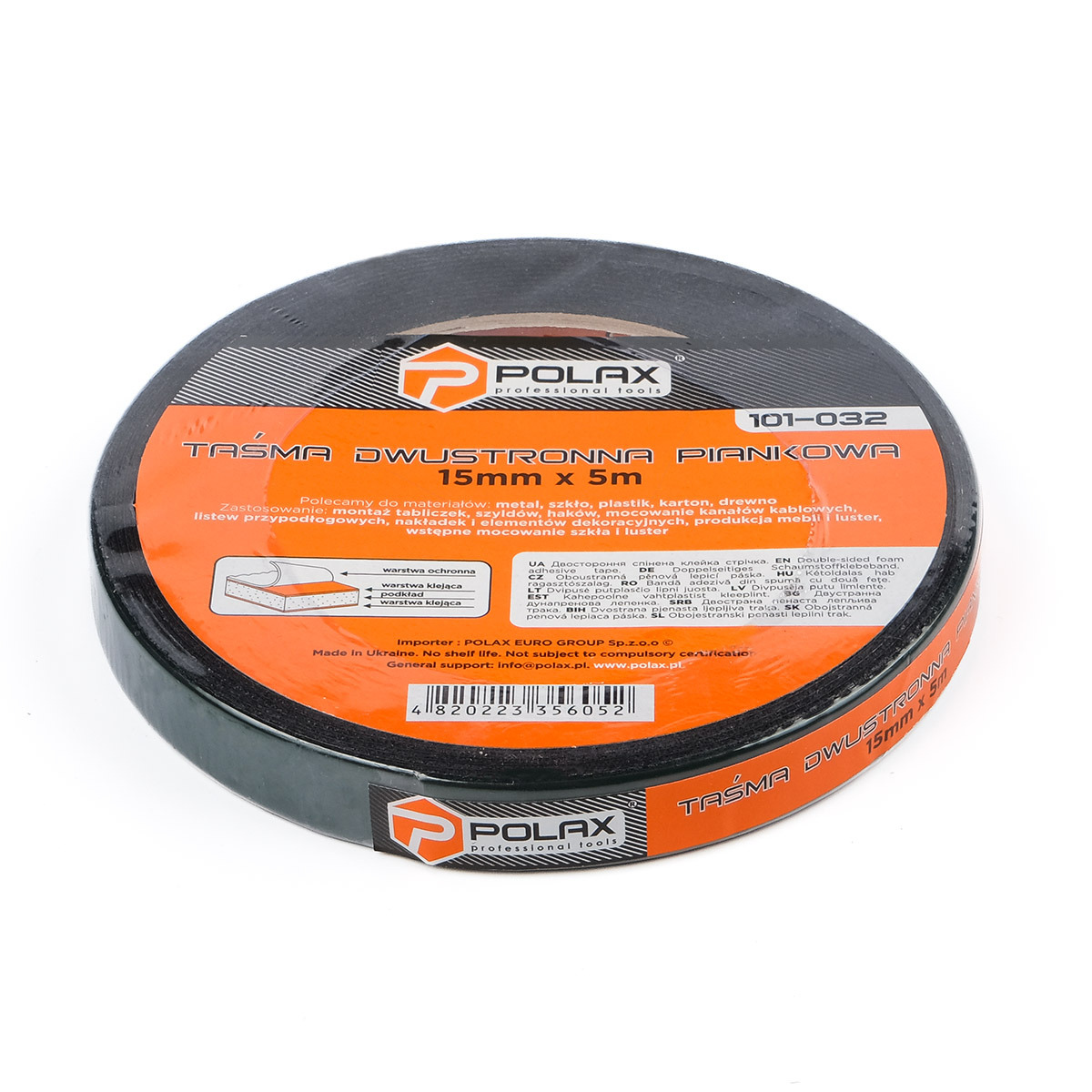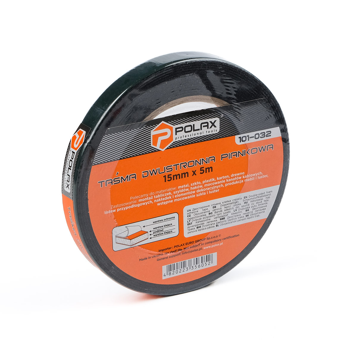 Taśma dwustronna na bazie pianki składa się ze wzmocnionego nośnika z czarnej pianki polietylenowej z klejem nałożonym po obu stronach. Warstwa kleju na bazie kauczuku syntetycznego zapewnia doskonałą przyczepność do impregnowanego drewna, metalu, plastiku, szkła, kartonu, ceramiki, kamienia, powierzchni malowanych itp. Miękka, spieniona, elastyczna, amortyzująca podstawa o grubości 1 mm amortyzuje wszelkie nierówności powierzchni i idealnie nadaje się do mocowania przedmiotów na nierównych i chropowatych powierzchniach, ściśle przylegając do wszelkich wgłębień i innych niedoskonałości materiałów. Posiada wysoki poziom odporności na wibracje mechaniczne, wibracje, przesunięcia itp. Dwustronna taśma klejąca zapewnia super mocne połączenie. Zalecany do stosowania na powierzchniach poziomych i pionowych wewnątrz pomieszczeń. Taśma dwustronnie klejąca Polax na bazie pianki pełnoziarnistej rozmiar ()