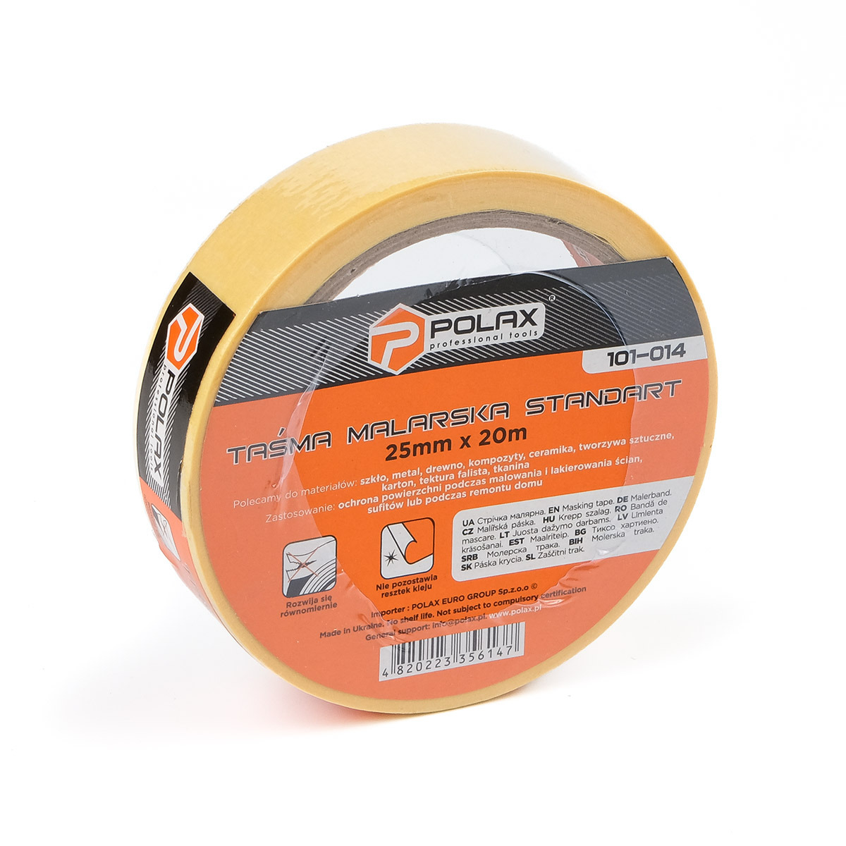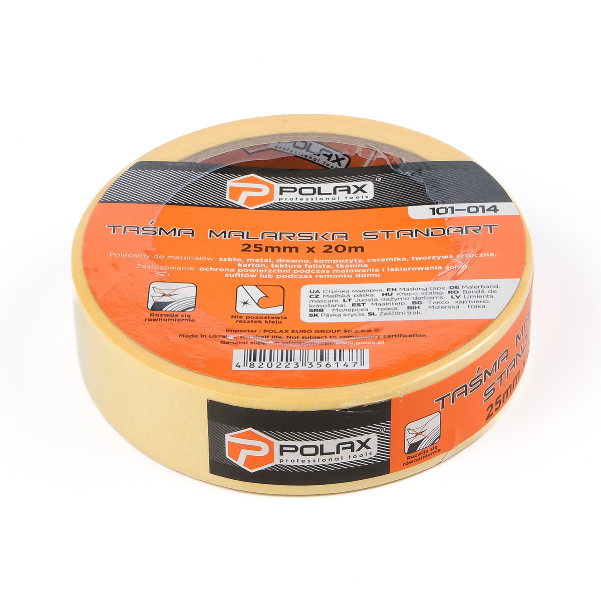 Taśma malarska przeznaczona jest do prac naprawczo-malarskich, stosowana w budownictwie oraz w warsztatach samochodowych. Głównym zadaniem taśmy maskującej jest stworzenie wyraźnej granicy pomiędzy kolorami przy malowaniu wielobarwnym we wnętrzach i na zewnątrz. Podczas procesu malowania i wykańczania zabezpiecza powierzchnie przed farbą i innymi substancjami płynnymi. Stosowany do naprawy książek i innych wyrobów papierowych. Świetnie nadaje się do tymczasowego mocowania różnych przedmiotów. Po usunięciu nie pozostawia śladów kleju. Służy do tworzenia arkusza ochronnego podczas wykonywania różnorodnych prac. Taśma malarska Polax Standard 25 mm x 20 m (101-014)