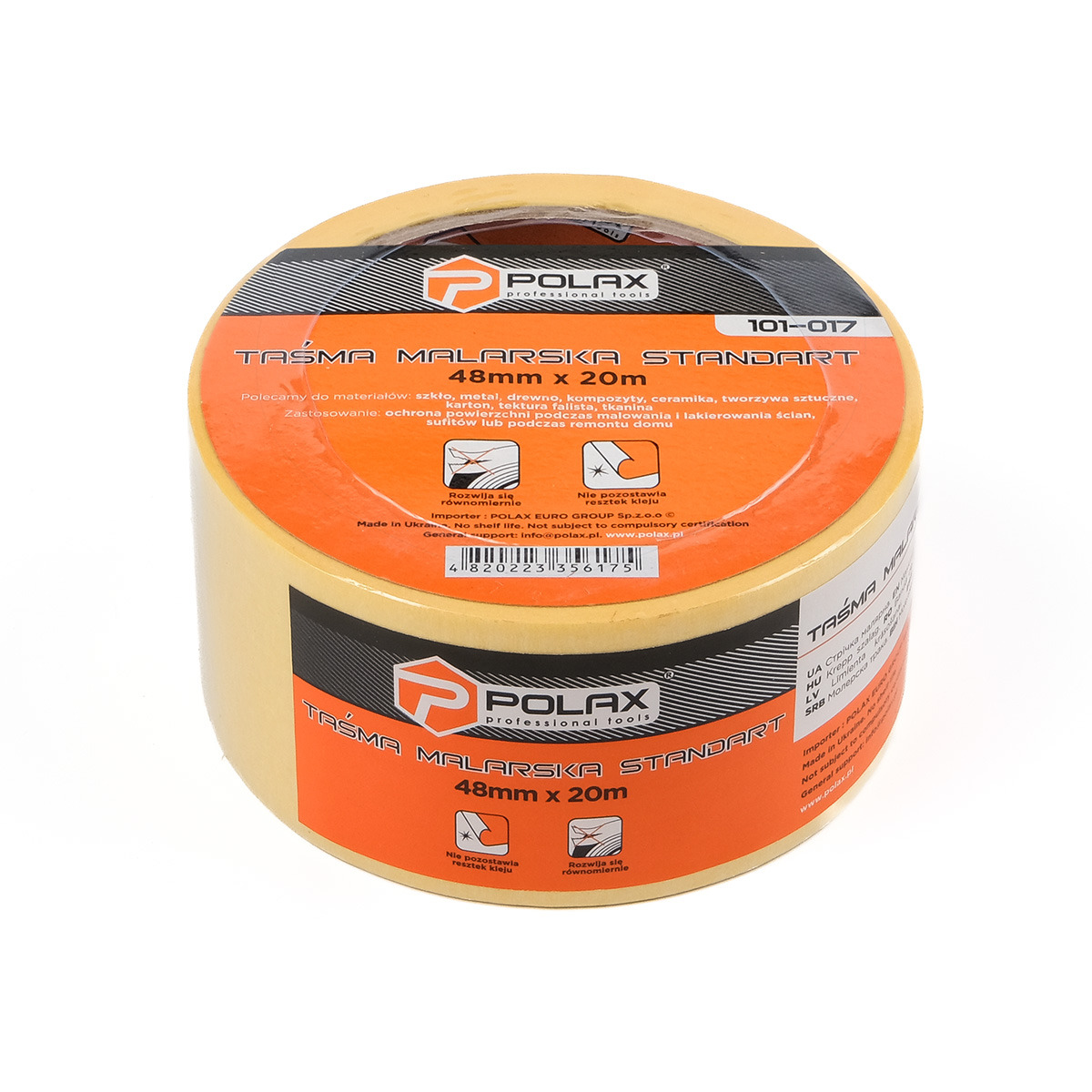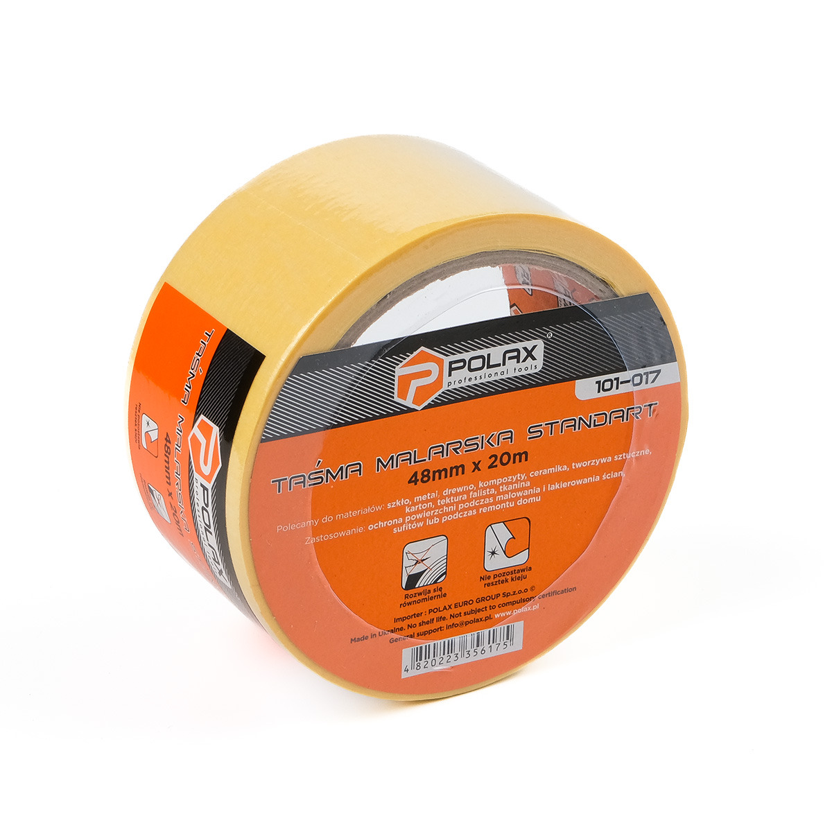 Taśma malarska przeznaczona jest do prac naprawczo-malarskich, stosowana w budownictwie oraz w warsztatach samochodowych. Głównym zadaniem taśmy maskującej jest stworzenie wyraźnej granicy pomiędzy kolorami przy malowaniu wielobarwnym we wnętrzach i na zewnątrz. Podczas procesu malowania i wykańczania zabezpiecza powierzchnie przed farbą i innymi substancjami płynnymi. Stosowany do naprawy książek i innych wyrobów papierowych. Świetnie nadaje się do tymczasowego mocowania różnych przedmiotów. Po usunięciu nie pozostawia śladów kleju. Służy do tworzenia arkusza ochronnego podczas wykonywania różnorodnych prac. Taśma malarska Polax Standard 48 mm x 20 m (101-017)
