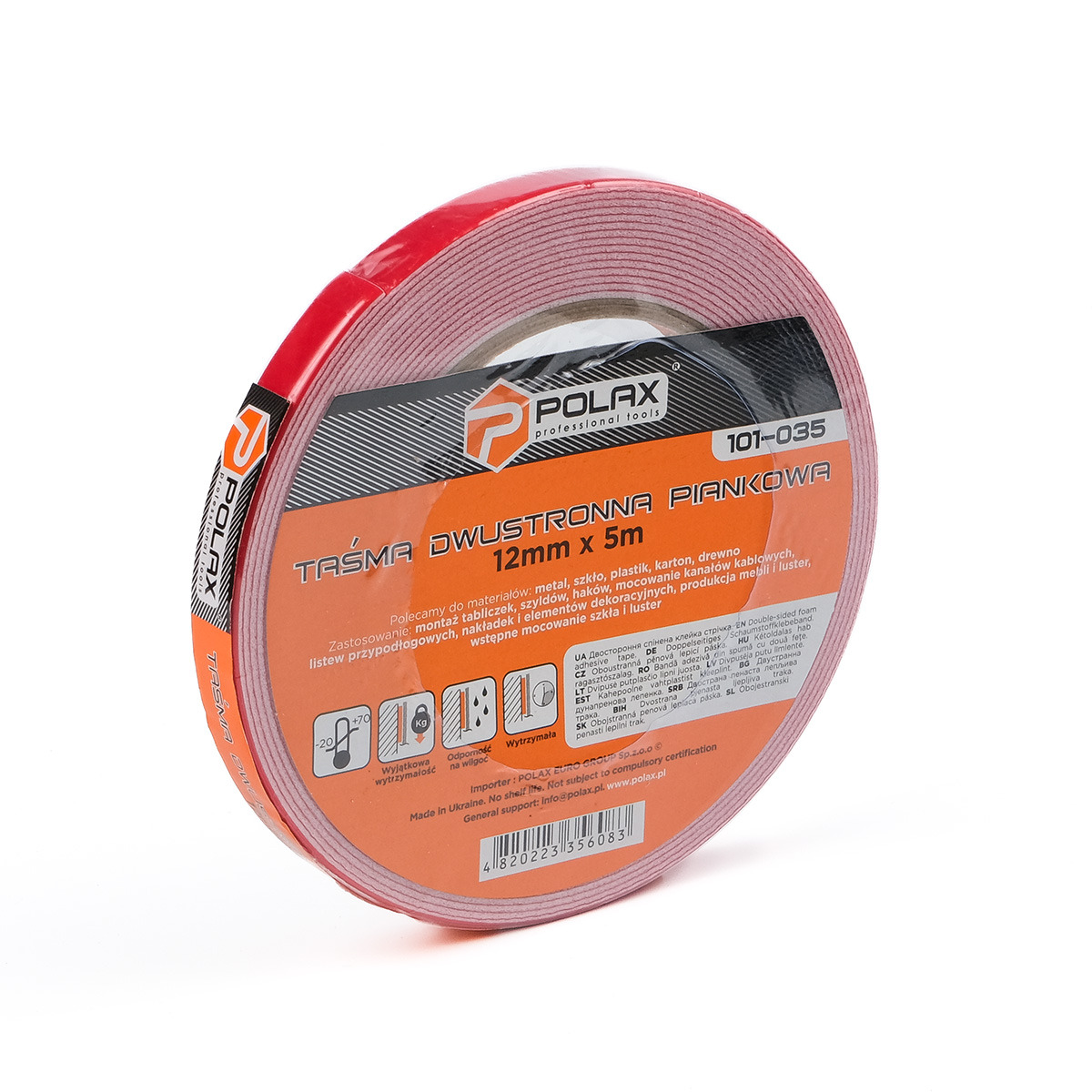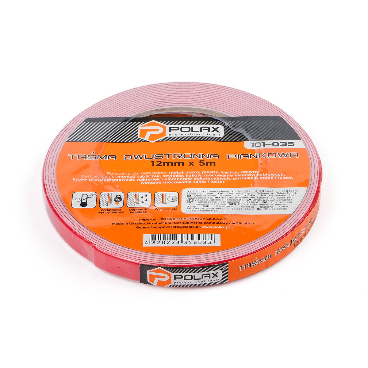 Dwustronna taśma piankowa składa się z białego nośnika z pianki polietylenowej z klejem nałożonym po obu stronach. Dzięki warstwie klejącej na bazie kauczuku syntetycznego taśma charakteryzuje się doskonałą przyczepnością do materiałów takich jak metal, drewno, ceramika, obrobiony kamień, szkło, tektura itp. Miękka, piankowa, elastyczna, amortyzująca podstawa o grubości 1 mm idealnie nadaje się do mocowania przedmiotów na nierównych i chropowatych powierzchniach, szczelnie przylegając do wszelkich wgłębień i innych niedoskonałości powierzchni. Posiada wysoki poziom odporności na wibracje mechaniczne, wibracje, przesunięcia itp. Pianka Scotch przeznaczona jest do stosowania na powierzchniach poziomych i pionowych wewnątrz pomieszczeń. Taśma dwustronnie klejąca Polax na podłożu piankowym 12 mm x 2 m (101-035)