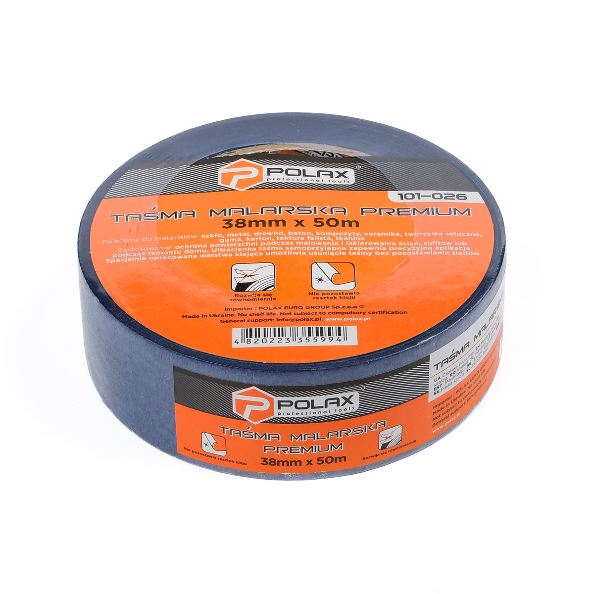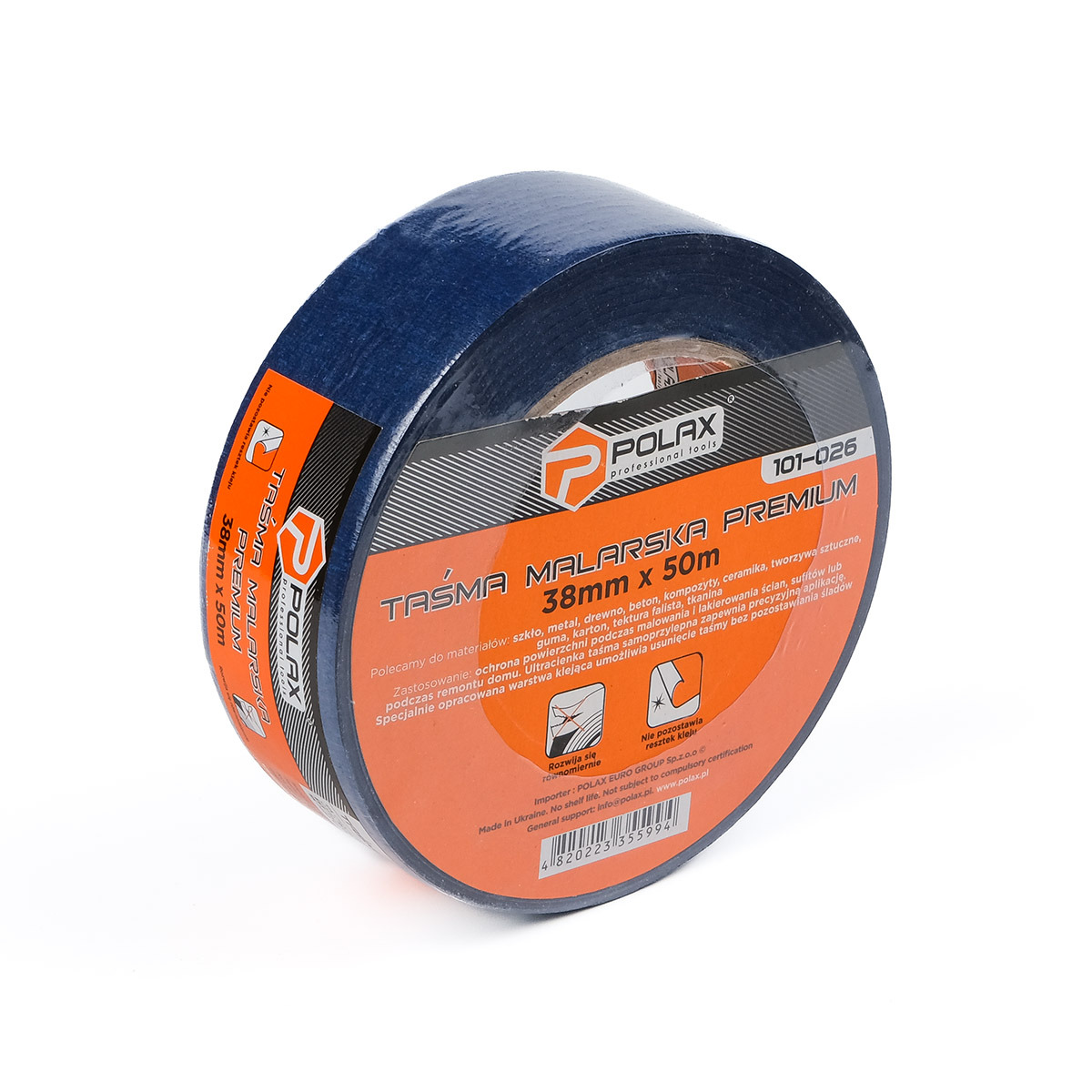 Taśma malarska przeznaczona jest do prac remontowych i malarskich na elewacjach, stosowana jest w budownictwie oraz w warsztatach samochodowych. Głównym zadaniem taśmy maskującej jest stworzenie wyraźnej granicy pomiędzy kolorami przy malowaniu wielobarwnym we wnętrzach i na zewnątrz. Stosowany do farb płynnych, zapobiega powstawaniu smug. Stosowany do użytku na zewnątrz na zakurzonych i strukturalnych powierzchniach. Taśma malarska Polax Premium 38 mm x 20 m (101-026)