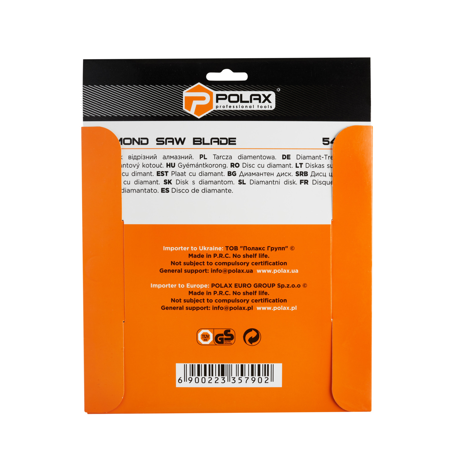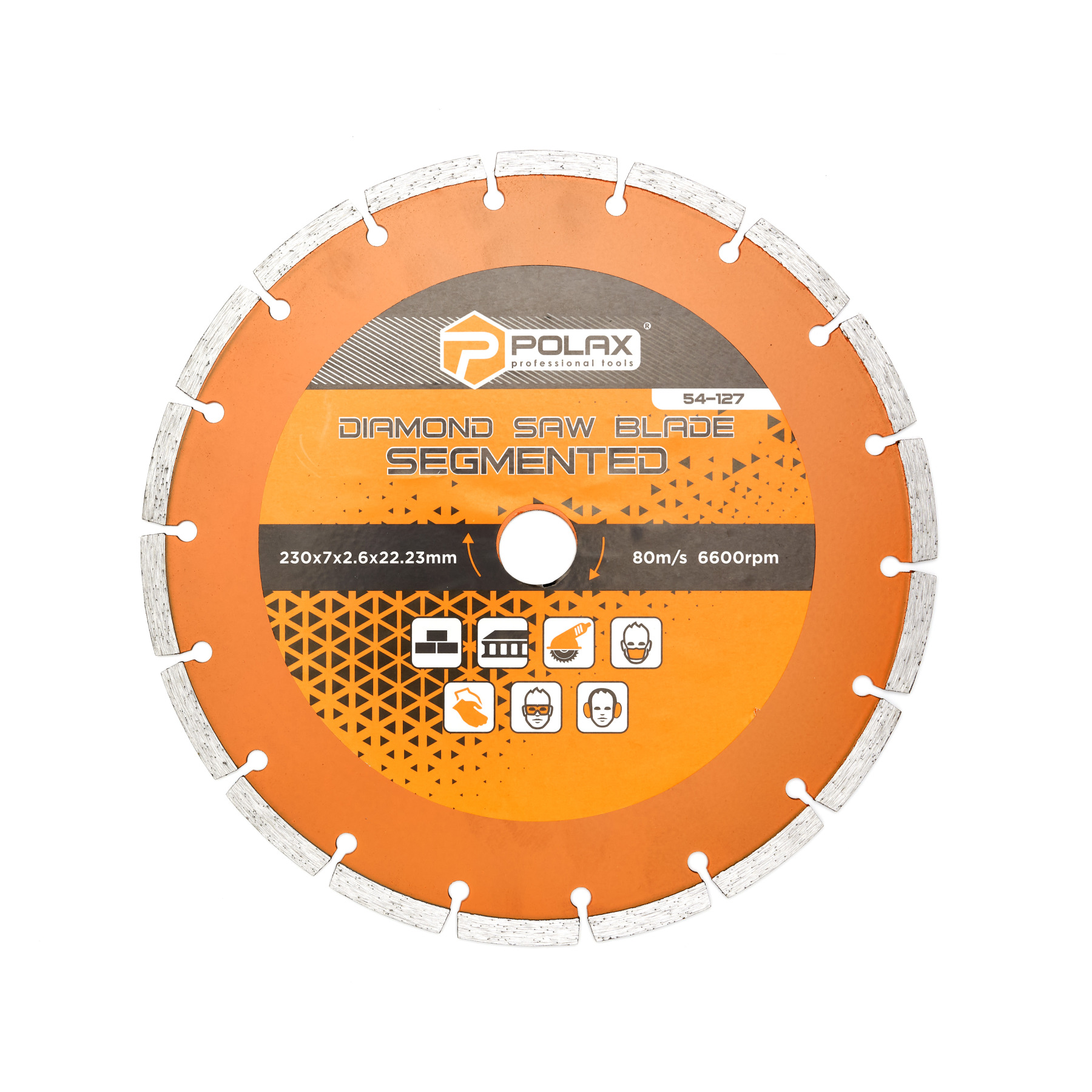 Tarcze diamentowe Polax „Segmentowane” przeznaczone są do cięcia na sucho materiałów budowlanych – betonu, cegły, kamienia i marmuru. Stosowany w szlifierce kątowej, ręcznej elektrycznej przecinarce do płytek, bruzdownicy ściennej. Składa się z segmentów diamentowych i stalowego korpusu. Posiada otwór montażowy z pierścieniem adapterowym o średnicy 22,2 mm. Posiada unikalną funkcję samoostrzenia zapewniającą wysoką wydajność cięcia, w której metalowa podstawa krawędzi tnącej pomaga usunąć zużyte elementy diamentowe i uwolnić nowe elementy diamentowe.