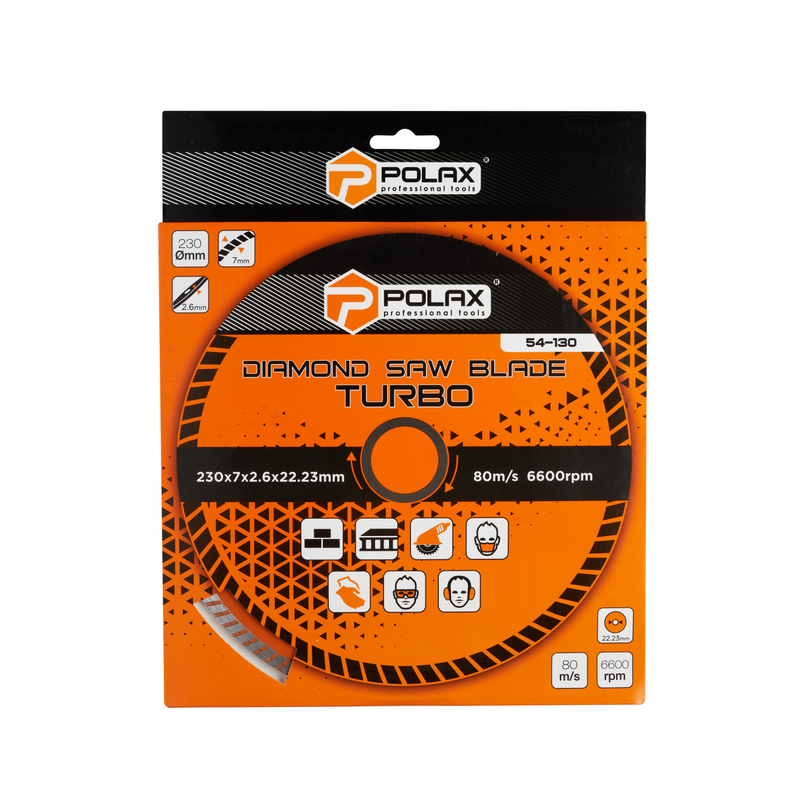 Tarcze diamentowe Polax „Turbo” przeznaczone są do cięcia na sucho materiałów budowlanych – betonu zbrojonego i krawężników, cegły, wszelkiego rodzaju piaskowca oraz płyt chodnikowych.