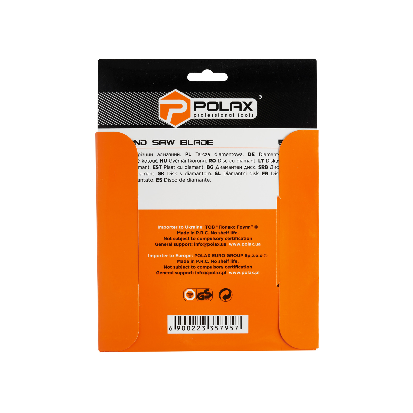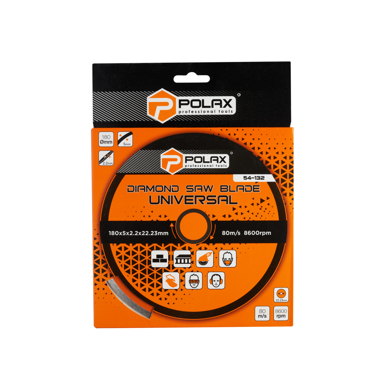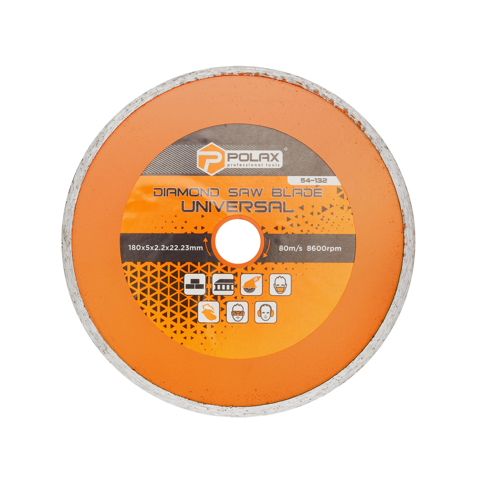 Tarcze diamentowe Polax Universal służą do cięcia wszelkiego rodzaju płytek i glazury. Posiada ciągłą krawędź, która zapobiega odpryskom i pęknięciom oraz pozwala na ultraprecyzyjne, delikatne cięcia. Średnica otworu montażowego wynosi 22,23 mm, wysokość warstwy diamentu 5 mm. Posiada unikalną funkcję samoostrzenia zapewniającą wysoką wydajność cięcia, w której metalowa podstawa krawędzi tnącej pomaga usunąć zużyte elementy diamentowe i uwolnić nowe elementy diamentowe. Tarcze Polax to wysokiej jakości tarcze, które znajdują szerokie zastosowanie zarówno przy naprawach domowych, jak i podczas wielkogabarytowych prac budowlanych. Do dysku dołączony jest pierścień adaptera.