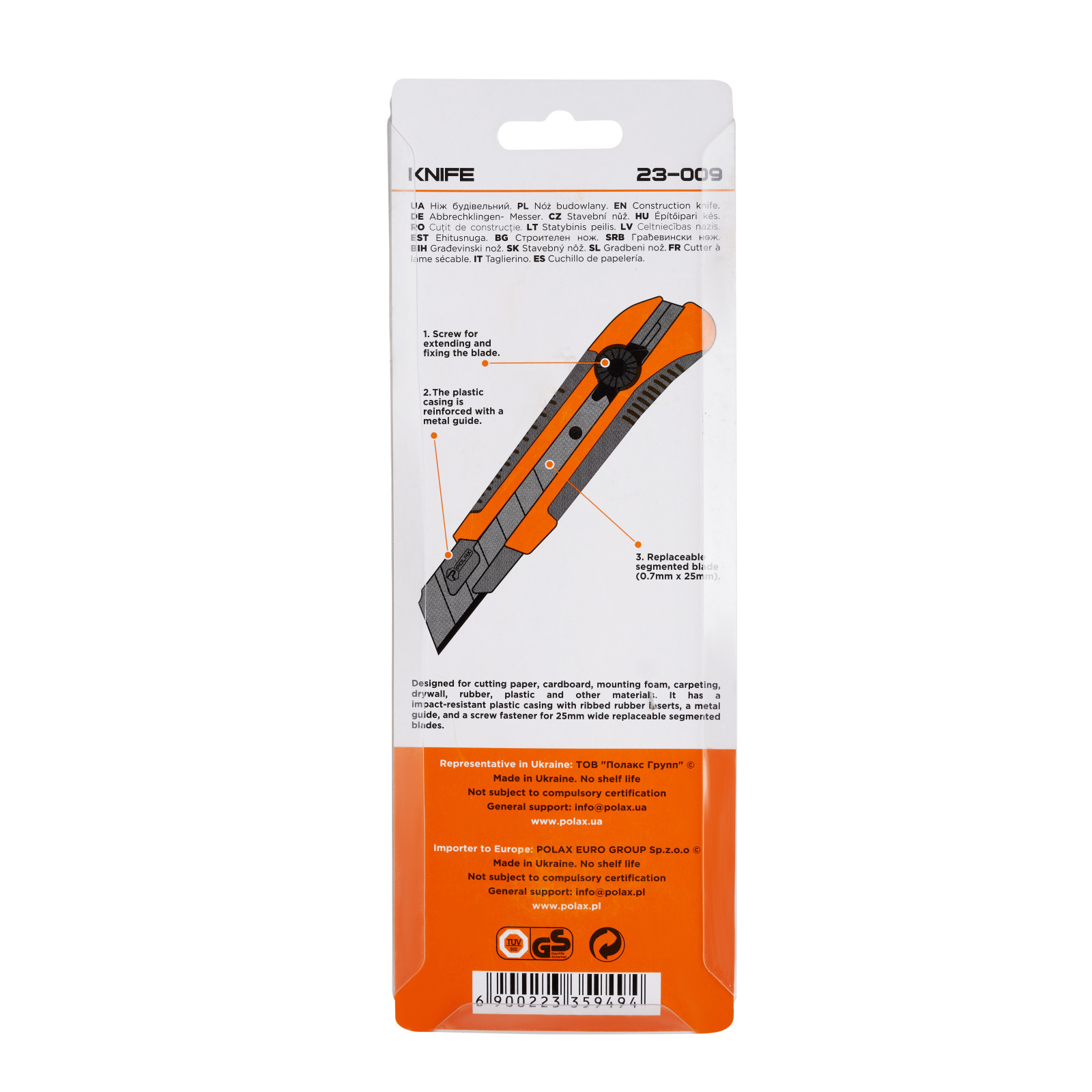 Główną cechą jest to, że ma plastikowy korpus wzmocniony stalową prowadnicą. Konstrukcja i kształt noża przyczyniają się do komfortowej pracy i wygodnego ułożenia narzędzia w dłoni. Nóż wyposażony jest w śrubową blokadę, która pewnie blokuje ostrze w wymaganej pozycji. Nóż konstrukcyjny Polax ma ergonomiczny kształt. Gumowana rękojeść zapewnia wygodne ułożenie narzędzia w dłoni i nie powoduje męczącej pracy. Korpus narzędzia wykonany jest z wytrzymałego tworzywa sztucznego i nie boi się dużych obciążeń. Stalowe ostrza zapewnią wysokiej jakości cięcie materiałów bez większego wysiłku fizycznego. Na obudowie znajduje się magnes.