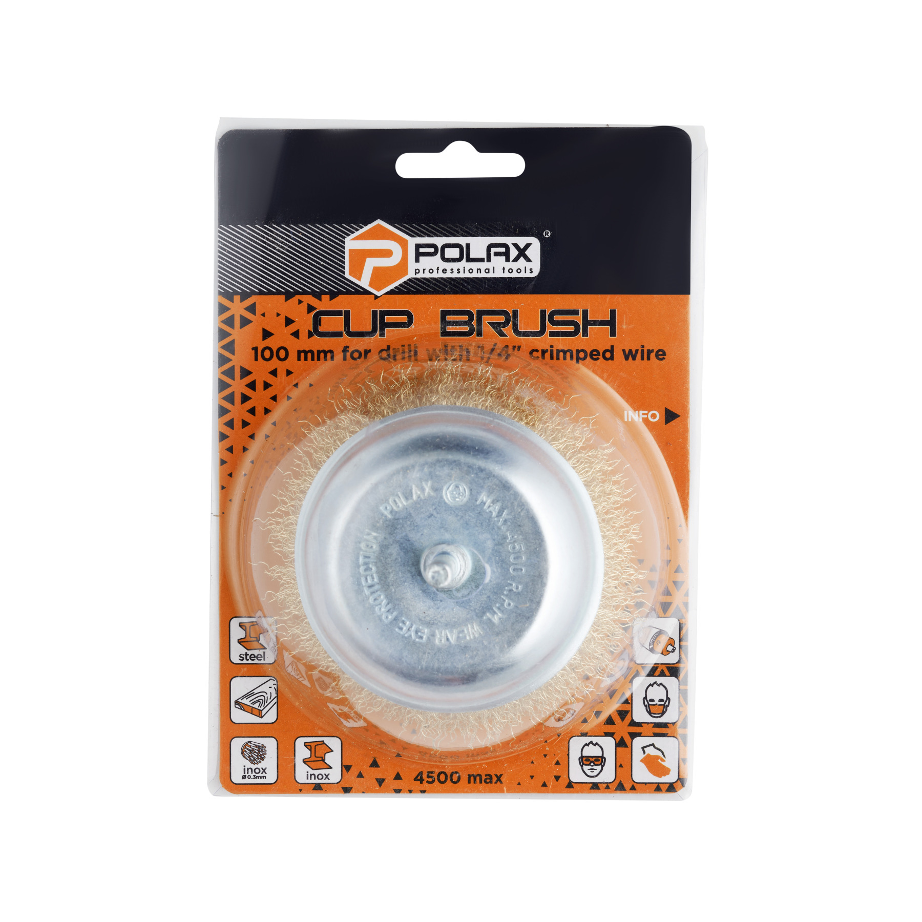 Pędzel w kształcie miseczki Polax można stosować w połączeniu z dowolnym rodzajem wiertarek ręcznych i elektrycznych. Przeznaczony jest do szybkiego czyszczenia powierzchni i elementów metalowych oraz innych ze starych farb, lakierów, korozji, śladów naturalnego starzenia (patyna), osadów brudu, także w miejscach trudno dostępnych. Produkt może być stosowany zarówno w życiu codziennym jak i w różnych gałęziach przemysłu do czyszczenia urządzeń i mechanizmów. Szczotka posiada metalową podstawę w kształcie miseczki z trzonkiem umożliwiającym podłączenie do wiertarki, a jej część robocza wykonana jest z wysokowytrzymałego i odpornego na odkształcenia drutu karbowanego, który charakteryzuje się dużą sztywnością i umiarkowaną elastycznością. Produkt jest odporny na zużycie, trwały i łatwy w utrzymaniu.