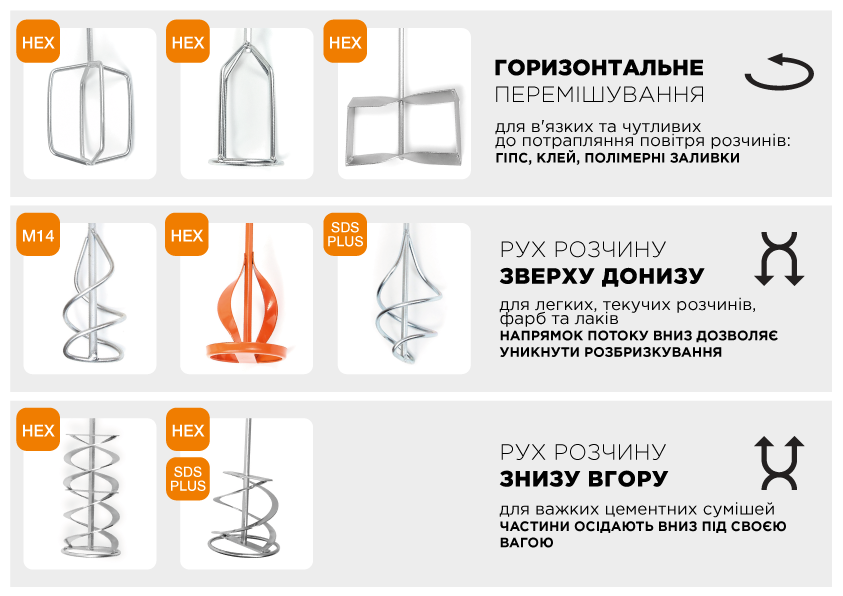 Spirala prawa jest zoptymalizowana do pracy z grubymi i gęstymi materiałami, takimi jak kit, tynk, klej do płytek i tapet. Skutecznie podnosi ciężkie cząstki z dna, zapewniając równomierne wymieszanie. Złącze typu HEX umożliwia łatwe podłączenie mieszalnika do wiertarki, wiertarki udarowej, wkrętarki lub specjalnego mieszalnika elektrycznego z uchwytem HEX.