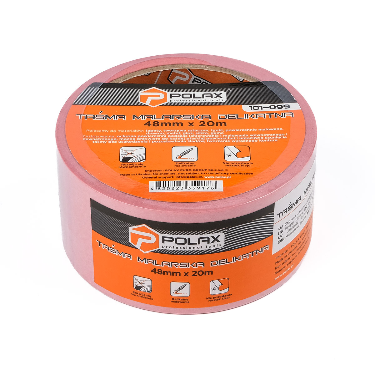 Różowa taśma maskująca wykonana jest z japońskiego papieru ryżowego Washi z modyfikowaną akrylową kulką klejącą, która charakteryzuje się niską przyczepnością (lepkością). Umiarkowana lepkość taśmy pozwala na jej stosowanie na powierzchniach teksturowanych i porowatych bez naruszania ich integralności. Idealny do delikatnych i innych powierzchni: tynków dekoracyjnych, gipsu, drewna, metalu, tworzyw sztucznych, szkła, gumy itp. Wzmocniony japoński podkład papierowy Washi eliminuje ryzyko przypadkowego rozerwania taśmy podczas usuwania jej z powierzchni oraz zapobiega przedostawaniu się materiałów malarskich i lakierniczych pod zabezpieczane miejsca. „Farba” ryżowa różowa zachowuje swoje właściwości w temperaturze do +80°C, zalecana do stosowania na gładkich i chropowatych powierzchniach wewnątrz i na zewnątrz. Taśma malarska Polax Delicate 48 mm x 20 m (101-099)
