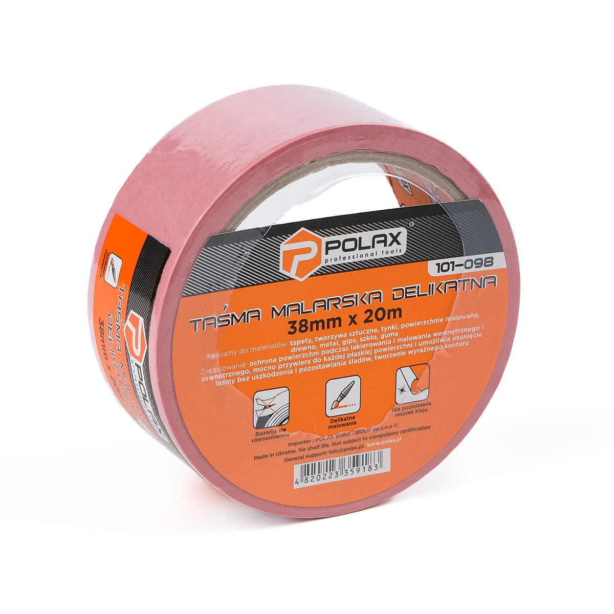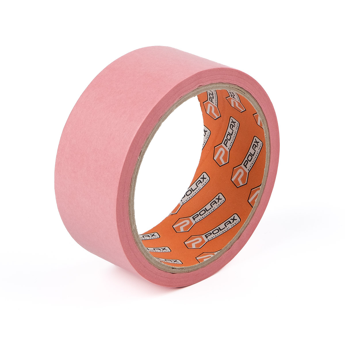 Różowa taśma maskująca wykonana jest z japońskiego papieru ryżowego Washi z modyfikowaną akrylową kulką klejącą, która charakteryzuje się niską przyczepnością (lepkością). Umiarkowana lepkość taśmy pozwala na jej stosowanie na powierzchniach teksturowanych i porowatych bez naruszania ich integralności. Idealny do delikatnych i innych powierzchni: tynków dekoracyjnych, gipsu, drewna, metalu, tworzyw sztucznych, szkła, gumy itp. Wzmocniony japoński podkład papierowy Washi eliminuje ryzyko przypadkowego rozerwania taśmy podczas usuwania jej z powierzchni oraz zapobiega przedostawaniu się materiałów malarskich i lakierniczych pod zabezpieczane miejsca. „Farba” ryżowa różowa zachowuje swoje właściwości w temperaturze do +80°C, zalecana do stosowania na gładkich i chropowatych powierzchniach wewnątrz i na zewnątrz. Taśma malarska Polax Delicate 38 mm x 20 m (101-098)