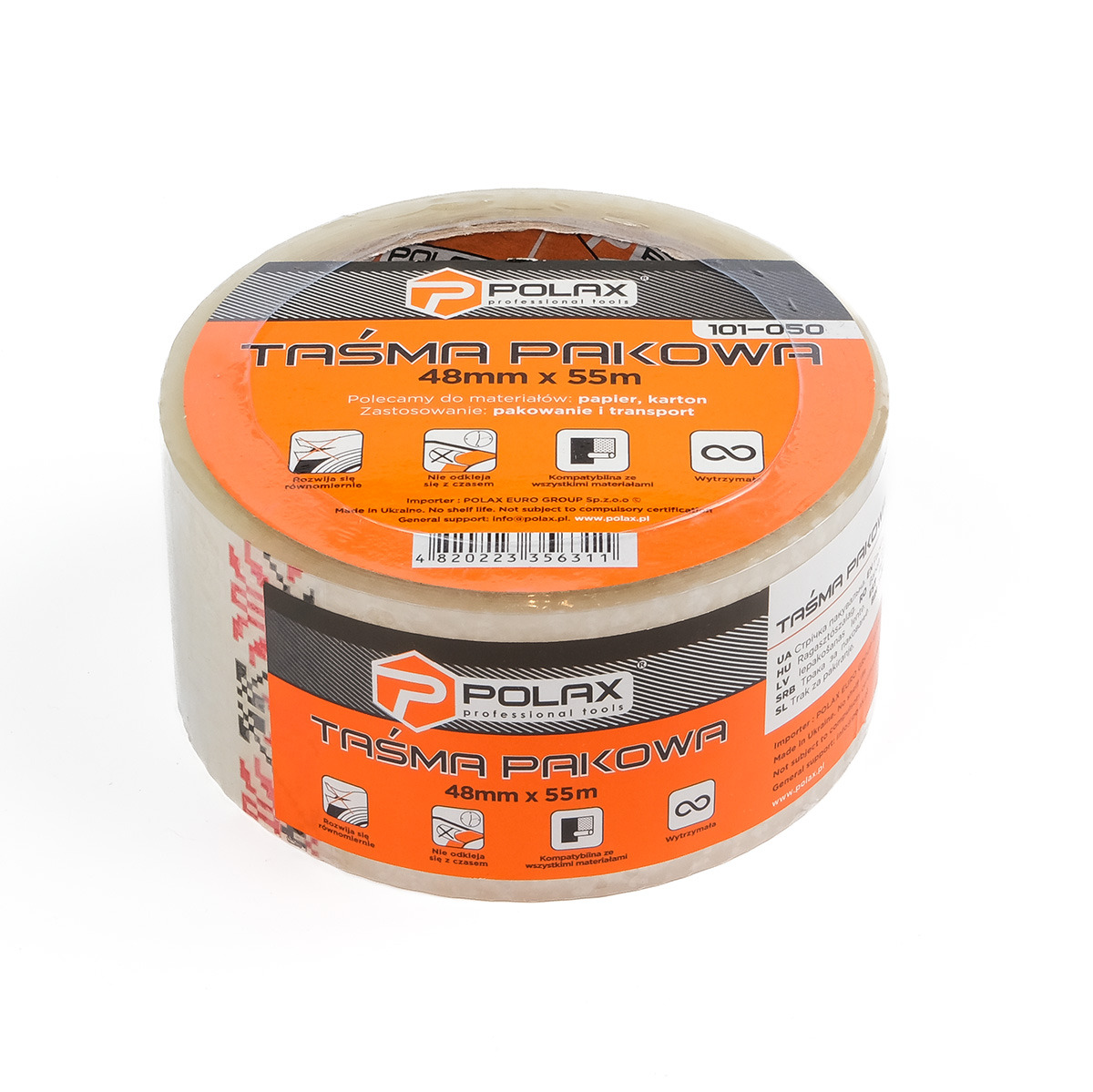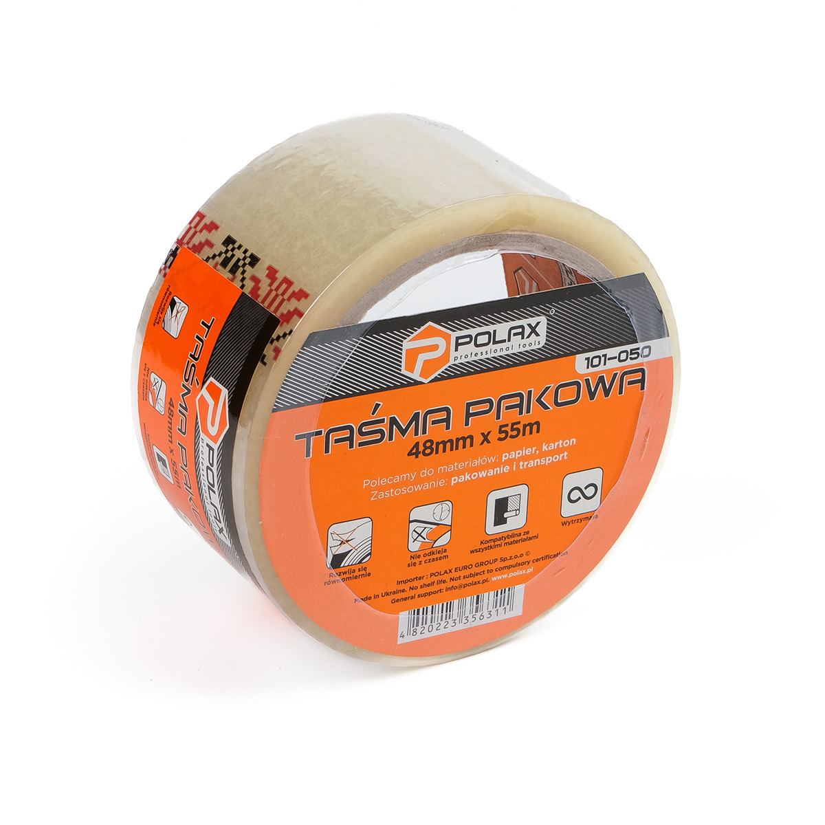 Tasma pakująca transparentna składa się z folii polipropylenowej, na którą nałożona jest warstwa kleju akrylowego. Taśma pakująca różni się zwiększoną wytrzymałością folii i wzmocnioną warstwą klejową, ogólna grubość taśmy wynosi 45 mikronów. Posiada doskonałą przyczepność do tektury, papieru, folii, tworzyw sztucznych, drewna i innych materiałów. Może być używana na zakurzonych powierzchniach, w warunkach umiarkowanej wilgotności, posiada stabilną odporność na promieniowanie słoneczne, zakres temperatury od -10 do +50°C. Nie posiada zapachu, zapewnia stabilne rozwijanie i rozciąganie bez ryzyka przypadkowego rozerwania, posiada średni poziom elastyczności.