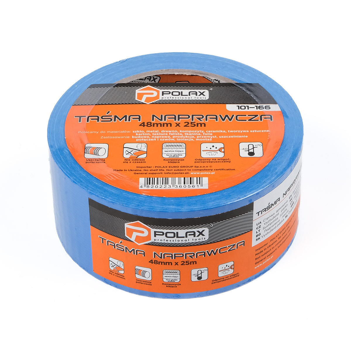 Taśma zbrojona to uniwersalny rodzaj taśmy budowlanej, charakteryzujący się zwiększoną wytrzymałością, niezawodnością, elastycznością, właściwościami izolacyjnymi i wodoodpornymi. Taśma wzmocniona może być używana podczas wykonywania prac hydraulicznych. Charakteryzuje się odpornością na wilgoć oraz odporność na rdzę i naprężenia mechaniczne, dlatego produkt doskonale nadaje się do uszczelniania rur, łączenia szwów oraz zabezpieczania kanałów powietrznych przed wilgocią i wodą. Taśma wzmocniona klejem pochodzącym z recyklingu służy do naprawy uszkodzeń na różnych powierzchniach. Produkt znajduje zastosowanie także przy pakowaniu towarów, gdyż gwarantuje ich ochronę przed wilgocią. Taśma zbrojona ze względu na swoje właściwości dielektryczne doskonale nadaje się do izolacji przewodów, ogrodzeń budowlanych, napraw samochodów itp. Taśma wzmocniona składa się z podłoża polipropylenowego pokrytego jednostronnie klejem. Wytrzymałość produktu zapewniają włókna tkaniny, które jednocześnie nadają taśmie elastyczność. Pomimo skomplikowanej technologii produkcji taśma jest dość cienka, dzięki czemu nadaje się do zaklejania nawet małych przedmiotów i powierzchni. Taśma klejąca wzmocniona Polax niebieska, 50 mm x 25 m (101-166)