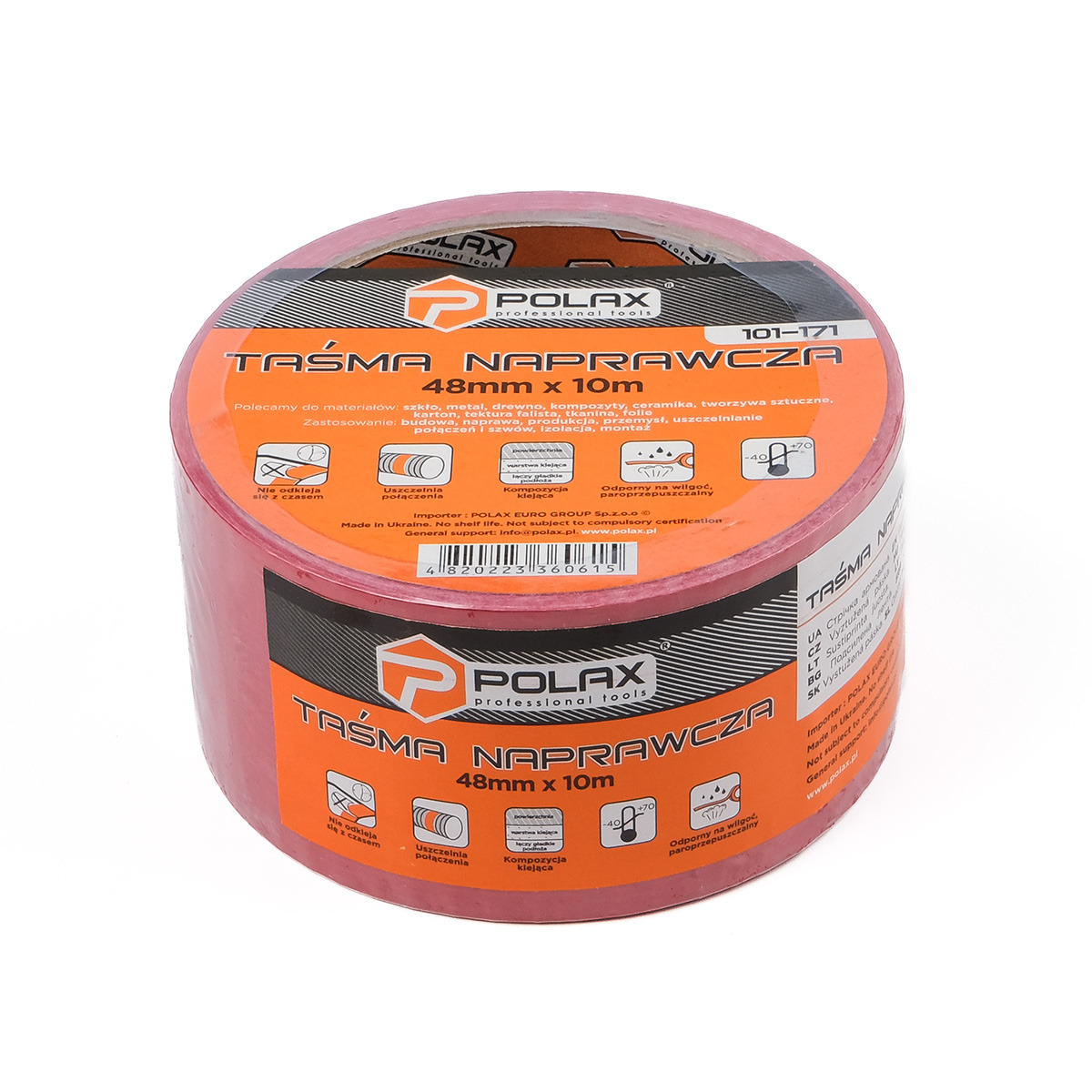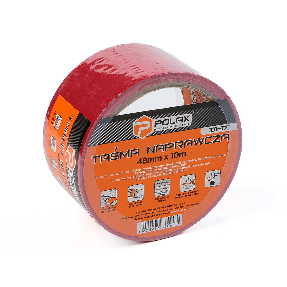 Taśma zbrojona to uniwersalny rodzaj taśmy budowlanej, charakteryzujący się zwiększoną wytrzymałością, niezawodnością, elastycznością, właściwościami izolacyjnymi i wodoodpornymi. Taśma wzmocniona może być używana podczas wykonywania prac hydraulicznych. Charakteryzuje się odpornością na wilgoć, odpornością na rdzę i różne obciążenia mechaniczne. Dlatego produkt doskonale nadaje się do uszczelniania rur, łączenia szwów oraz zabezpieczania kanałów powietrznych przed wilgocią i wodą. W życiu codziennym taśma wzmocniona klejem służy do naprawy uszkodzeń na różnych powierzchniach. Produkt stosowany przy pakowaniu towarów, gdyż gwarantuje ich ochronę przed wilgocią. Taśma zbrojona ze względu na swoje właściwości dielektryczne doskonale nadaje się do izolacji przewodów, ogrodzeń budowlanych, napraw samochodów itp. Taśma wzmocniona składa się z podłoża polipropylenowego pokrytego jednostronnie klejem. Wytrzymałość produktu zapewniają włókna tkaniny, które jednocześnie nadają taśmie elastyczność. Pomimo skomplikowanej technologii produkcji taśma jest dość cienka, dzięki czemu nadaje się do zaklejania nawet małych przedmiotów i powierzchni. Taśma klejąca wzmocniona Polax czerwona 50 mm x 10 m (101-171)