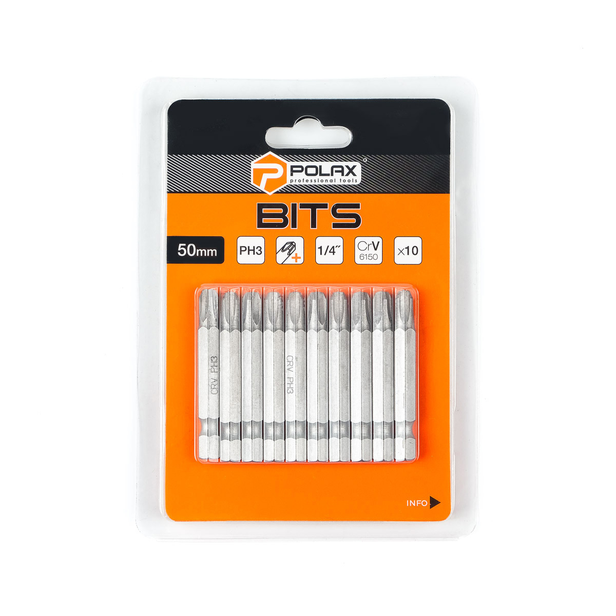 Bity stalowe Polax 50 mm PH3 1/4", 10 szt. (51-076) wykonane są z wysokiej jakości stali chromowo-wanadowej CRV 6150 , która charakteryzuje się dużą wytrzymałością i odpornością na zużycie. Materiał ten gwarantuje niezawodność i długą żywotność bit PH3 jest typu łbowego przeznaczonego do śrub Phillips i wkrętów o rozmiarze 1/4" zapewniających kompatybilność z większością standardowych uchwytów i śrub. śrubokręt Bity mają wyjątkowo długą długość 50 mm , dzięki czemu idealnie nadają się do pracy z głębokimi śrubami i wkrętami, a także do docierania do trudno dostępnych miejsc. W zestawie znajduje się 10 bitów, co wystarczy do wykonania różnorodnych zadań bez konieczności ciągłej zmiany bitów. Bit Polax 50 mm PH3 w CRV 6150 zapewnia doskonały chwyt śrub, zmniejszając ryzyko uszkodzenia śruby i ułatwiając pracę.