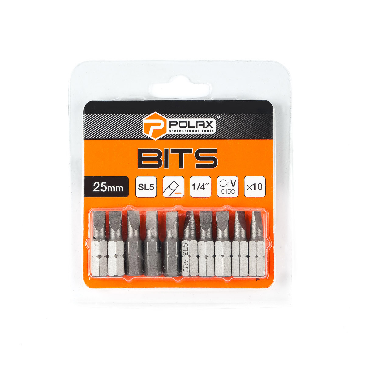 Bit stalowy Polax 25 mm SL5 1/4", 10 szt. (51-069) - wykonany z wysokiej jakości stali chromowo-wanadowej CRV 6150, która charakteryzuje się dużą wytrzymałością i odpornością na zużycie. Materiał ten gwarantuje niezawodność i długą żywotność Bity mają rozmiar gniazda SL5 i standardowy rozmiar 1/4", co zapewnia kompatybilność z większością standardowych uchwytów i wkrętaków. Bity te nadają się do pracy ze śrubami i śrubami z rowkiem (płaskim łbem). Są to popularne typy elementów złącznych, a bity SL5 idealnie nadają się do ich montażu i demontażu. Bity mają standardową długość 25 mm, dzięki czemu nadają się do szerokiego zakresu zastosowań, w tym do montażu mebli, renowacji domów i innych prac budowlanych i renowacyjnych. W zestawie znajduje się 10 bitów, co wystarczy do wykonania różnorodnych zadań bez konieczności ciągłej zmiany bitów. Te bity będą niezbędnym narzędziem w Twoim zestawie do rękodzieła, szczególnie podczas pracy ze śrubami i śrubami z rowkiem.