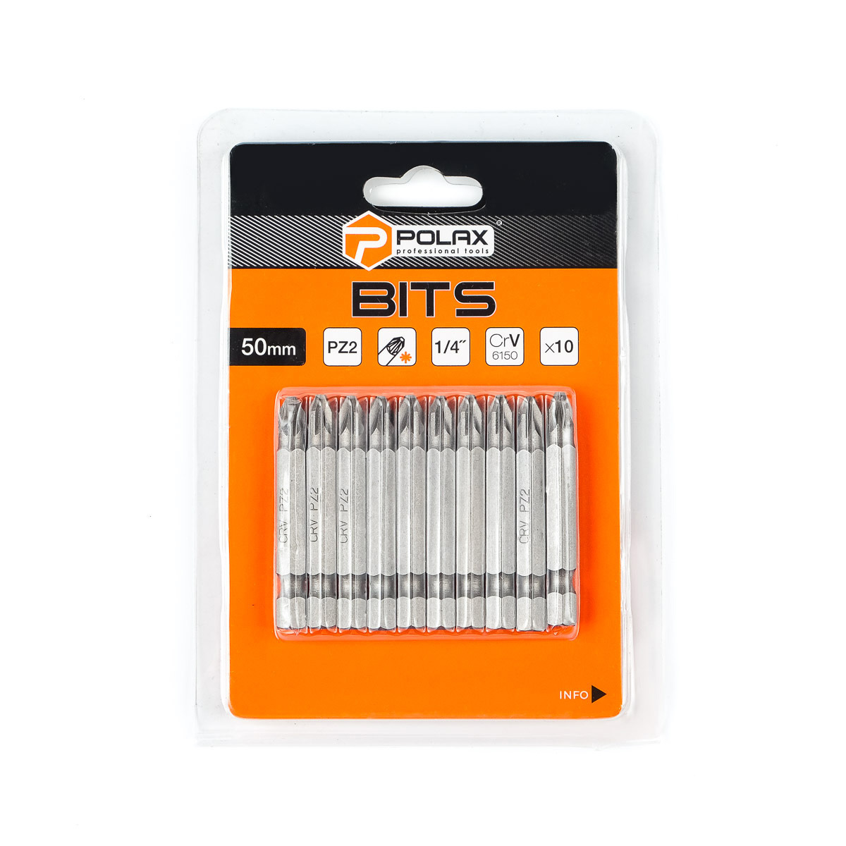 Bit stalowy Polax 50 mm PZ2 1/4", 10 szt. (51-081) - wykonany z wysokiej jakości stali chromowo-wanadowej CRV 6150 , która charakteryzuje się dużą wytrzymałością i odpornością na zużycie. Materiał ten gwarantuje niezawodność i długą żywotność Bity mają rozmiar gniazda PZ2 i standardowy rozmiar 1/4" , co zapewnia kompatybilność z większością standardowych uchwytów i wkrętaków. Bity te nadają się do pracy ze śrubami i wkrętami z łbem Phillipsa. Są to powszechnie stosowane elementy złączne, a bity PZ2 idealnie nadają się do ich montażu i demontażu. Bity mają standardową długość 50 mm , dzięki czemu nadają się do szerokiego zakresu zastosowań, w tym do montażu mebli, renowacji domów i innych prac budowlanych i renowacyjnych. W zestawie znajduje się 10 bitów, co wystarczy do wykonania różnorodnych zadań bez konieczności ciągłej zmiany bitów. Te bity będą niezbędnym narzędziem w Twoim zestawie do majsterkowania, zwłaszcza podczas pracy ze śrubami i śrubami z rowkiem.