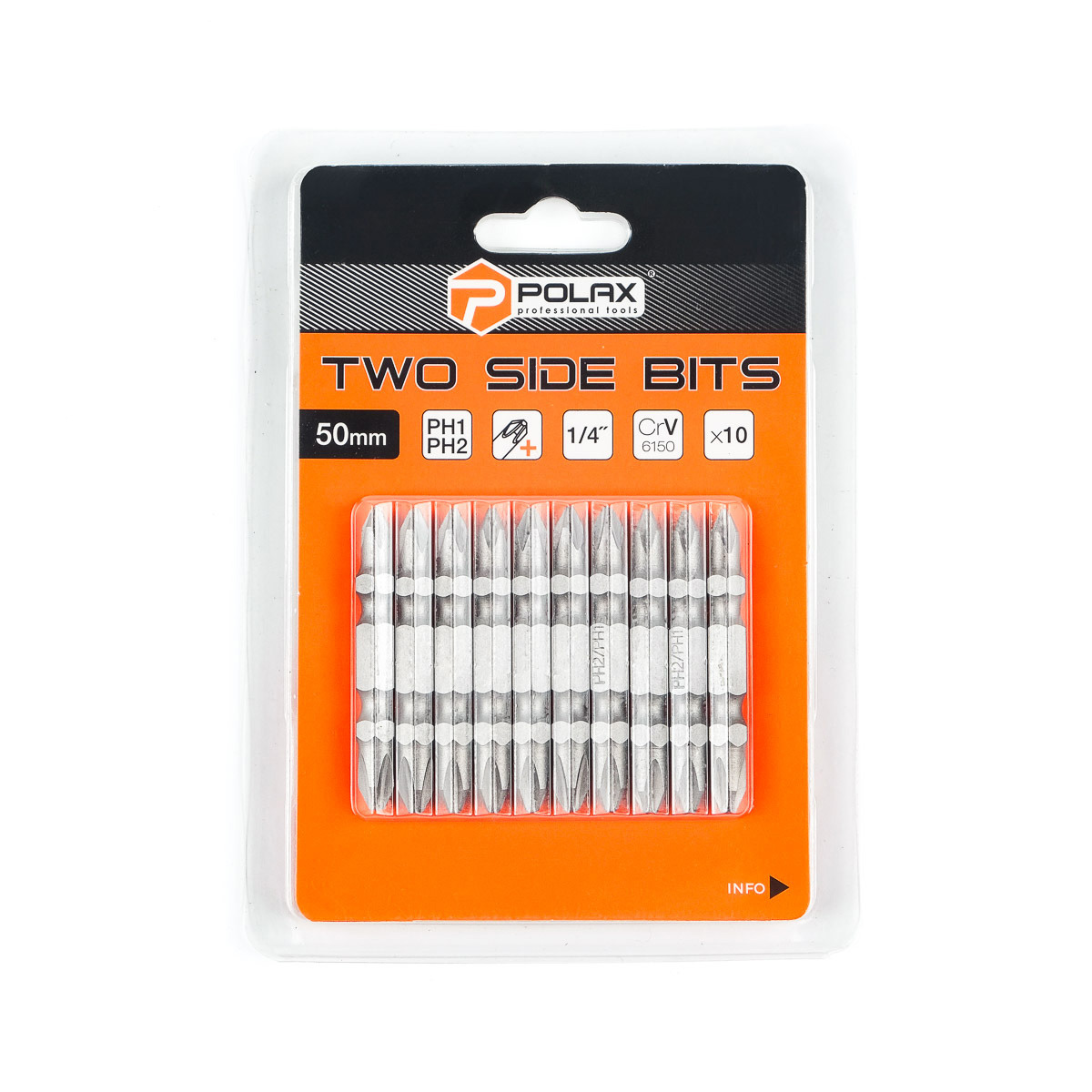 Bit stalowy dwustronny Polax 50 mm PH1-PH2 1/4", 10 szt. (51-083) to niezawodne narzędzie, dzięki któremu Twoje zadania będą jeszcze wygodniejsze i wydajniejsze. Kluczową cechą tego bitu jest zastosowanie wysokiej wysokiej jakości stali CrV, która gwarantuje jego wytrzymałość i długą żywotność. Długość kija wynosi 50 mm, co sprawia, że jest łatwy w użyciu. Jednak najbardziej niesamowitą cechą tego kija jest jego dwustronna konstrukcja. Wyposażony jest w gniazdo PH1, a z drugiej gniazdo PH2, co czyni go uniwersalnym rozwiązaniem do pracy z różnego rodzaju wkrętami i wkrętami. Nie będziesz już tracić czasu na szukanie odpowiedniego bitu - po prostu go odwróć!