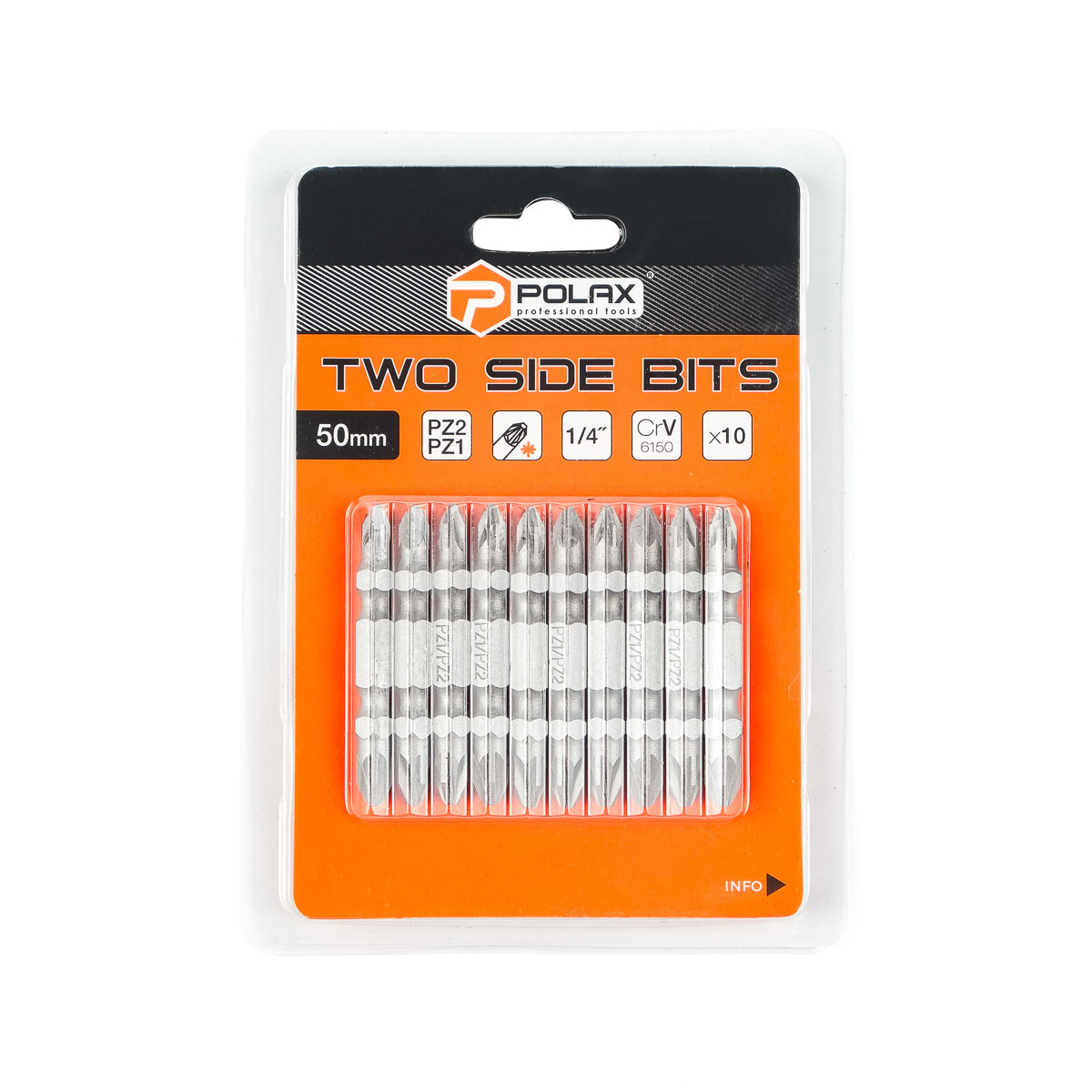 Bit stalowy dwustronny Polax 50 mm PZ2-PZ1 1/4", 10 szt. (51-087) to niezawodne narzędzie, dzięki któremu Twoje zadania będą jeszcze wygodniejsze i wydajniejsze. Kluczową cechą tego bitu jest zastosowanie wysokiej wysokiej jakości stali CrV, która gwarantuje jego wytrzymałość i długą żywotność. Długość kija wynosi 50 mm, co sprawia, że jest łatwy w użyciu. Jednak najbardziej niesamowitą cechą tego kija jest jego dwustronna konstrukcja. Z jednej strony wyposażony jest w gniazdo PZ2, a z drugiej w gniazdo PZ1, co czyni go uniwersalnym rozwiązaniem do pracy z różnego rodzaju wkrętami i wkrętami. Nie będziesz już tracić czasu na szukanie odpowiedniego bitu - po prostu odwróć to!