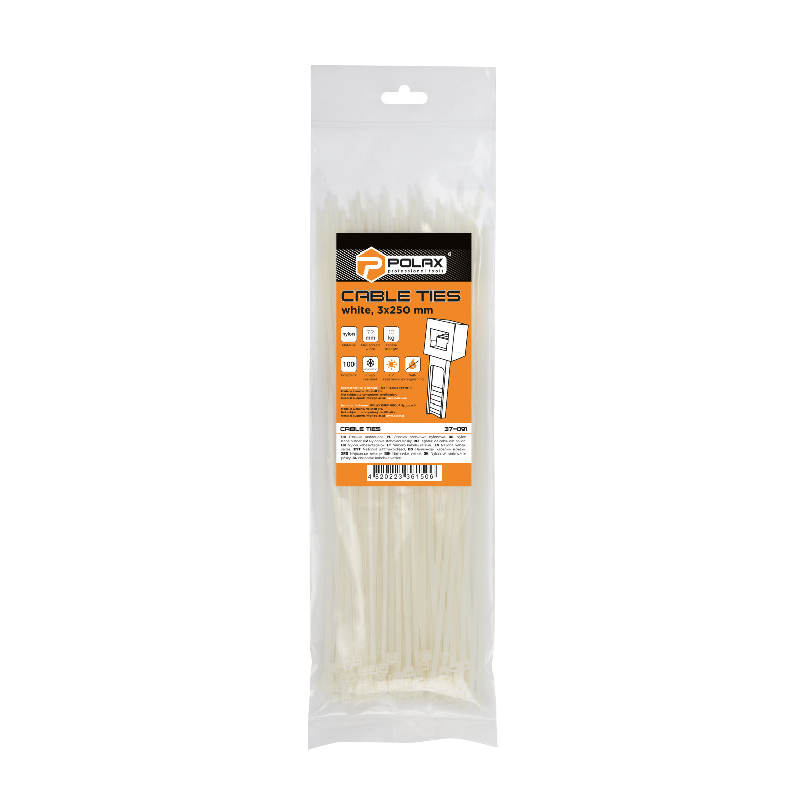 Zacisk plastikowy (opaska) Polax nylon 3 x 250 mm, biały 100 szt. (37-091) - niezawodne i uniwersalne rozwiązanie umożliwiające skuteczne mocowanie i porządkowanie różnorodnych elementów. Ten zestaw 100 białych nylonowych zacisków o wymiarach 3 x 250 mm zapewnia mocne i niezawodne połączenie w różnych zastosowaniach. Charakteryzują się optymalnymi wymiarami: 3 x 250 mm, co czyni je idealnymi do mocowania kabli, rur, przewodów i innych przedmiotów o różnych rozmiarach. Materiał nylonowy zapewnia wytrzymałość i elastyczność, a także odporność na wilgoć i czynniki zewnętrzne. Obejmy nylonowe Polax przeznaczone są do stosowania w instalacjach elektrycznych, organizowaniu systemów kablowych, a także do zabezpieczania rur i innych elementów w domu, biurze lub fabryce. Dostępne w opakowaniach po 100 sztuk, stanowią wygodne i ekonomiczne rozwiązanie dla różnorodnych projektów, które wymagają szybkiego, mocnego i schludnego mocowania.
