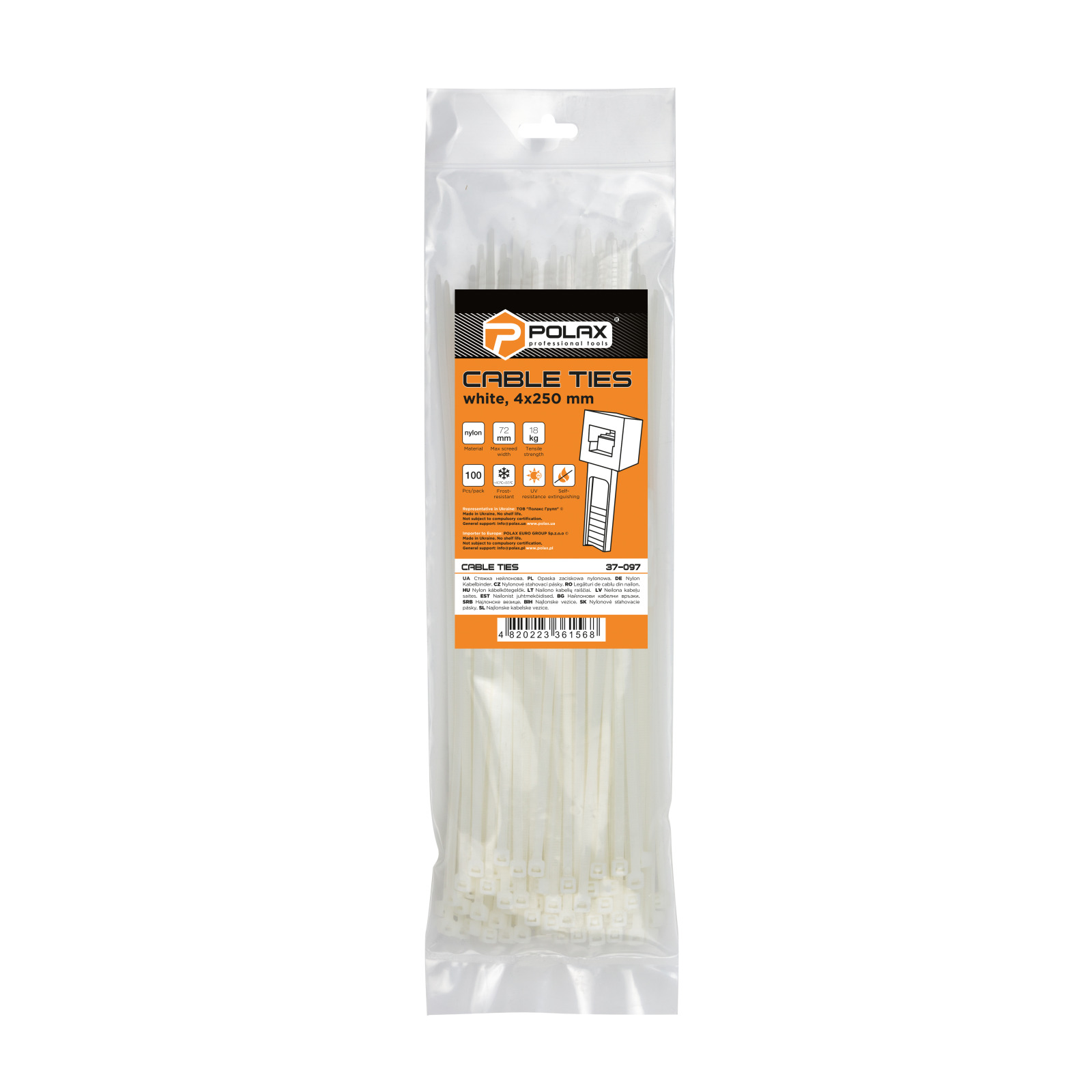 Zacisk plastikowy (opaska) Polax nylon 4 x 250 mm, biały 100 szt. (37-097) - niezawodne i wszechstronne rozwiązanie umożliwiające skuteczne mocowanie i porządkowanie różnych elementów. Zestaw 100 białych nylonowych zacisków o wymiarach 4 x 250 mm zapewnia mocne i niezawodne połączenie do różnych zastosowań. Charakteryzują się optymalnymi wymiarami: 4 x 250 mm, co czyni je idealnymi do mocowania kabli, rur, przewodów i innych przedmiotów o różnych rozmiarach. Materiał nylonowy zapewnia wytrzymałość i elastyczność, a także odporność na wilgoć i czynniki zewnętrzne. Obejmy nylonowe Polax przeznaczone są do stosowania w instalacjach elektrycznych, organizowaniu systemów kablowych, a także do zabezpieczania rur i innych elementów w domu, biurze czy fabryce. Dostępne w opakowaniach po 100 sztuk, stanowią wygodne i ekonomiczne rozwiązanie dla różnorodnych projektów, które wymagają szybkiego, mocnego i schludnego mocowania.