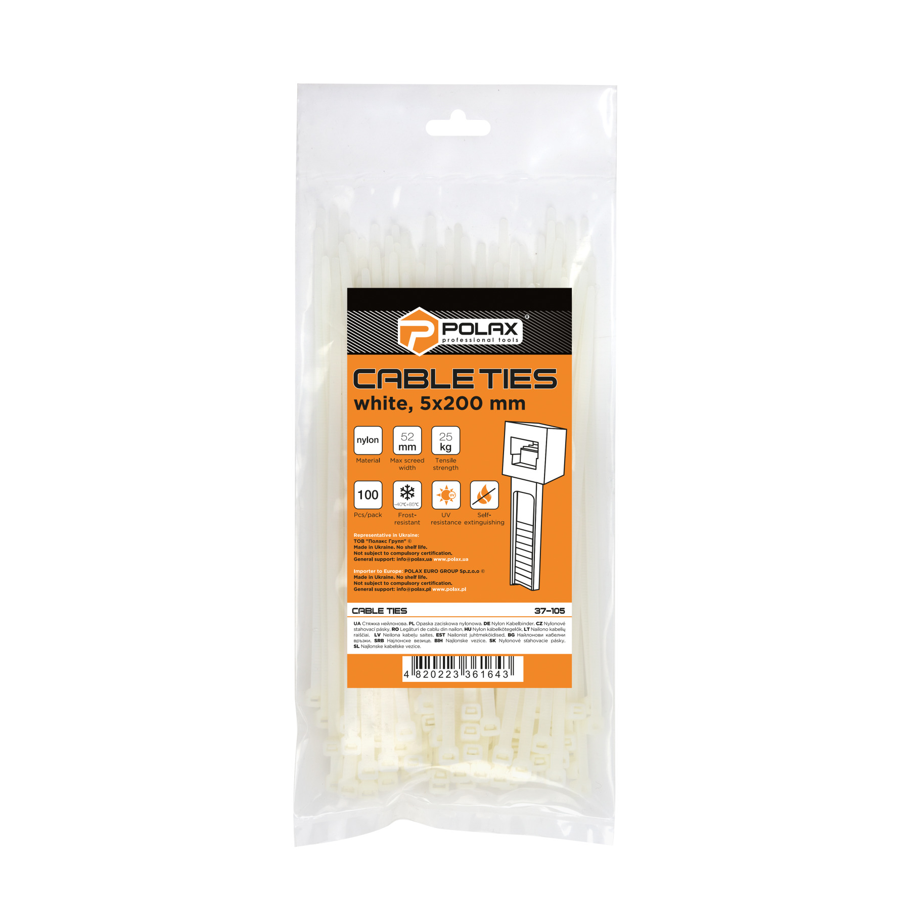 Zacisk plastikowy (opaska) Polax nylon 5 x 200 mm, biały 100 szt. (37-105) - niezawodne i uniwersalne rozwiązanie umożliwiające skuteczne mocowanie i porządkowanie różnorodnych elementów. Ten zestaw 100 białych nylonowych zacisków o wymiarach 5 x 200 mm zapewnia mocne i niezawodne połączenie do różnych zastosowań. Charakteryzują się optymalnymi wymiarami: 5 x 200 mm, co czyni je idealnymi do mocowania kabli, rur, przewodów i innych przedmiotów o różnych rozmiarach. Materiał nylonowy zapewnia wytrzymałość i elastyczność, a także odporność na wilgoć i czynniki zewnętrzne. Obejmy nylonowe Polax przeznaczone są do stosowania w instalacjach elektrycznych, organizowaniu systemów kablowych, a także do zabezpieczania rur i innych elementów w domu, biurze czy fabryce. Dostępne w opakowaniach po 100 sztuk, stanowią wygodne i ekonomiczne rozwiązanie dla różnorodnych projektów, które wymagają szybkiego, mocnego i schludnego mocowania.