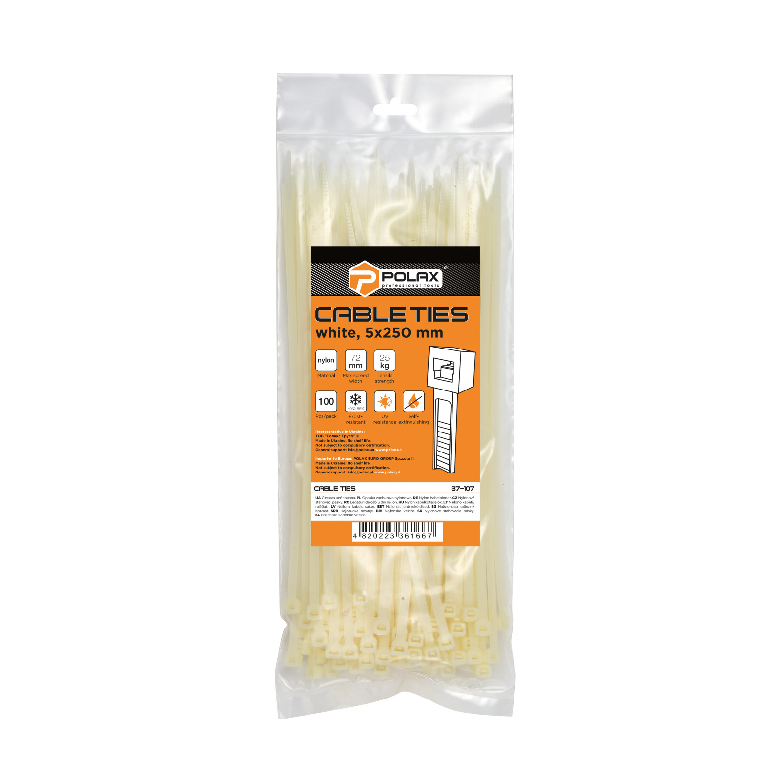 Zacisk plastikowy (opaska) Polax nylon 5 x 250 mm, biały 100 szt. (37-107) - niezawodne i wszechstronne rozwiązanie umożliwiające skuteczne mocowanie i porządkowanie różnych elementów. Ten zestaw 100 białych nylonowych zacisków o wymiarach 5 x 250 mm zapewnia mocne i niezawodne połączenie do różnych zastosowań. Charakteryzują się optymalnymi wymiarami: 5 x 250 mm, co czyni je idealnymi do mocowania kabli, rur, przewodów i innych przedmiotów o różnych rozmiarach. Materiał nylonowy zapewnia wytrzymałość i elastyczność, a także odporność na wilgoć i czynniki zewnętrzne. Obejmy nylonowe Polax przeznaczone są do stosowania w instalacjach elektrycznych, organizowaniu systemów kablowych, a także do zabezpieczania rur i innych elementów w domu, biurze czy fabryce. Dostępne w opakowaniach po 100 sztuk, stanowią wygodne i ekonomiczne rozwiązanie dla różnorodnych projektów, które wymagają szybkiego, mocnego i schludnego mocowania.