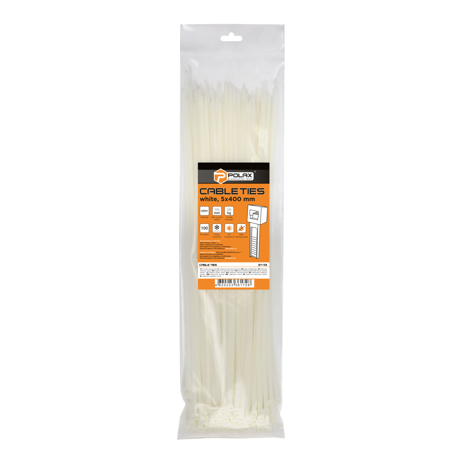 Zacisk plastikowy (opaska) Polax nylon 5 x 400 mm, biały 100 szt. (37-113) - niezawodne i uniwersalne rozwiązanie umożliwiające skuteczne mocowanie i porządkowanie różnorodnych elementów. Ten zestaw 100 białych nylonowych zacisków o wymiarach 5 x 400 mm zapewnia mocne i niezawodne połączenie do różnych zastosowań. Charakteryzują się optymalnymi wymiarami: 5 x 400 mm, co czyni je idealnymi do mocowania kabli, rur, przewodów i innych przedmiotów o różnych rozmiarach. Materiał nylonowy zapewnia wytrzymałość i elastyczność, a także odporność na wilgoć i czynniki zewnętrzne. Obejmy nylonowe Polax przeznaczone są do stosowania w instalacjach elektrycznych, organizowaniu systemów kablowych, a także do zabezpieczania rur i innych elementów w domu, biurze lub fabryce. Dostępne w opakowaniach po 100 sztuk, stanowią wygodne i ekonomiczne rozwiązanie dla różnorodnych projektów, które wymagają szybkiego, mocnego i schludnego mocowania.