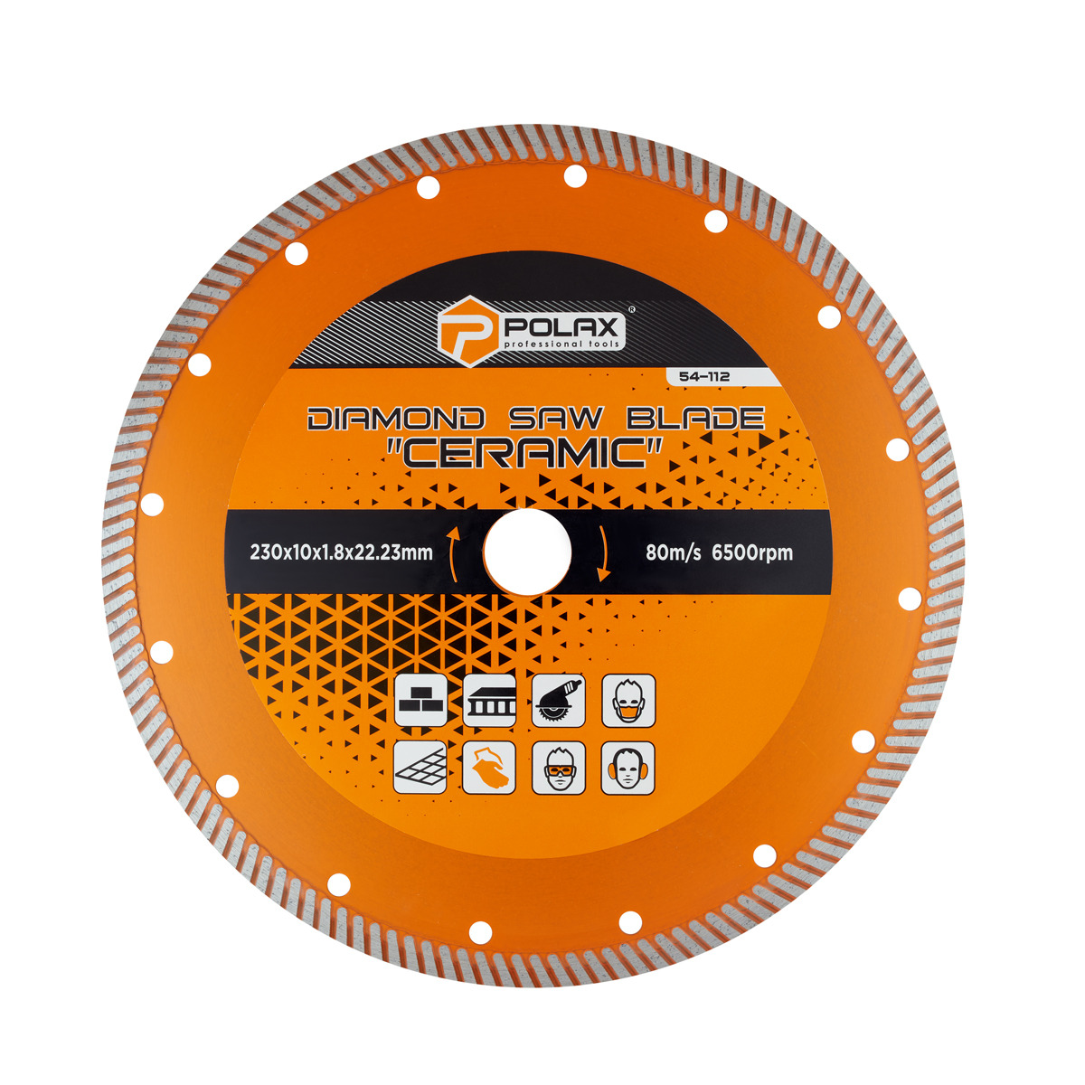 Tarcze diamentowe Polax Ceramic dzięki zmniejszonej grubości (najcieńsze tarcze diamentowe w ofercie Polax) pozwalają na szybkie i precyzyjne cięcia, unikając odprysków, a także pracę przy mniejszym obciążeniu szlifierki. Zapewnia dokładne cięcie i polerowanie krawędzi płytek. Zoptymalizowany do cięcia na sucho płytek ceramicznych bez chłodzenia, dzięki turbodoładowanej krawędzi tnącej , ostrze jest aktywnie chłodzone podczas pracy. Nadaje się również do cięcia cegły, płyt chodnikowych, betonu, płytek i innych materiałów budowlanych.