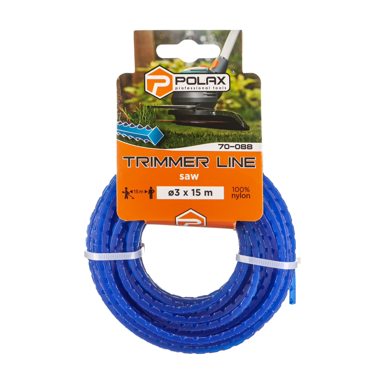 Żyłka tnąca „Saw” to wyjątkowo mocna żyłka służąca do koszenia trawy. Wykonane z wysokiej jakości nylonu. Posiada wysoką elastyczność, wytrzymałość i odporność na zużycie. Żyłka ma kształt ząbkowanego kwadratu. Specjalny profil w kształcie piły nadaje się do cięcia grubej roślinności i umożliwia cięcie nawet trzcin. Przeznaczenie: sucha trawa, małe krzewy, łopian. Profil piły zapewnia niski poziom wibracji i hałasu. Grubość linii dobierana jest zgodnie z parametrami trymera.