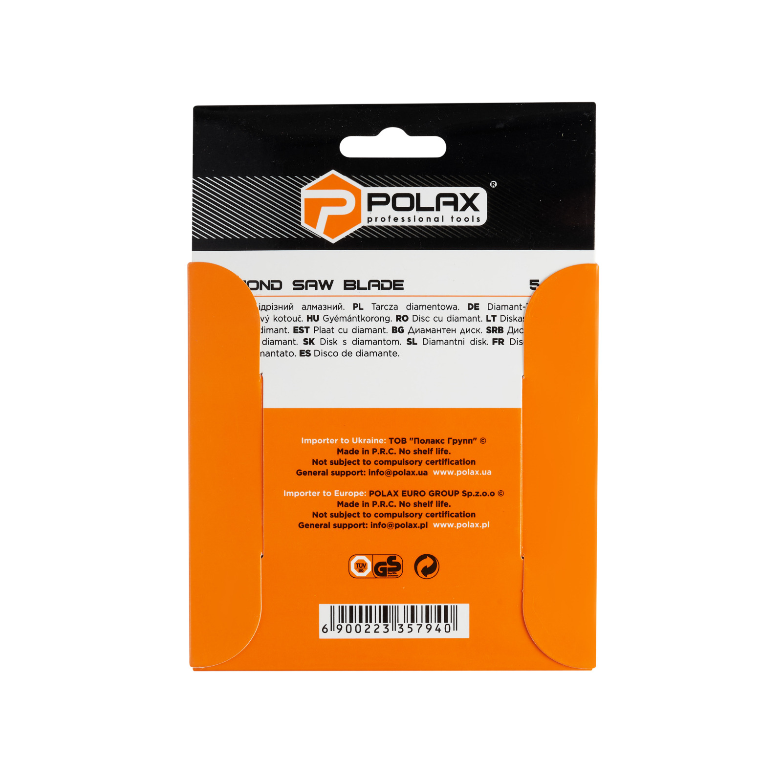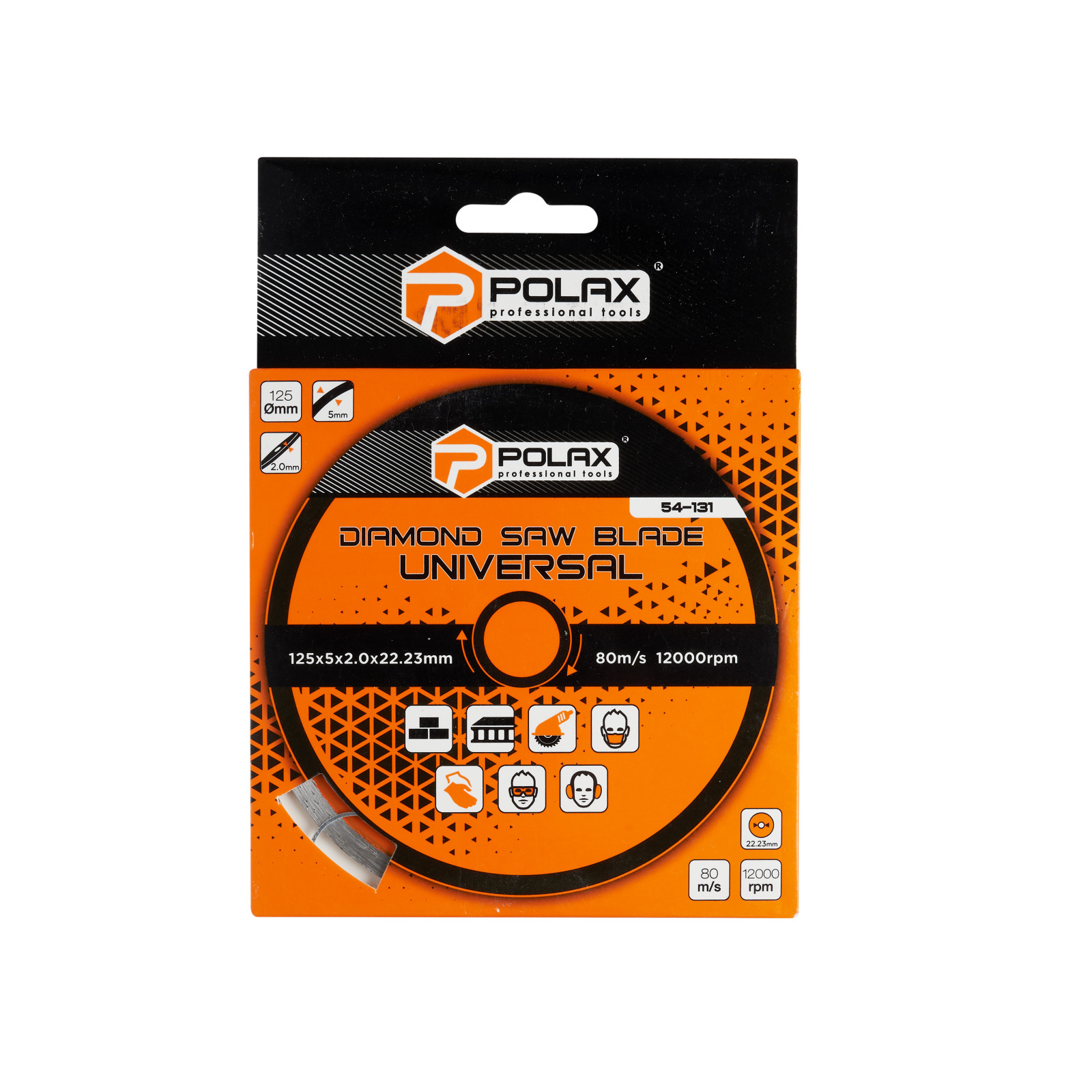 Uniwersalne tarcze diamentowe Polax służą do cięcia wszystkich rodzajów płytek. Posiada ciągłą krawędź, która zapobiega odpryskom i pęknięciom, a także umożliwia niezwykle precyzyjne i delikatne cięcie. Średnica otworu montażowego wynosi 22,23 mm, wysokość warstwy diamentowej wynosi 5 mm. Posiada unikalną funkcję samoostrzenia, która zapewnia wysoką wydajność cięcia, w której metalowa podstawa krawędzi tnącej pomaga usuwać zużyte elementy diamentowe i uwalniać nowe. Tarcze Polax to wysokiej jakości tarcze, które znajdują szerokie zastosowanie zarówno przy domowych naprawach, jak i podczas prac budowlanych na dużą skalę. Zestaw tarcz posiada pierścień adaptera.
