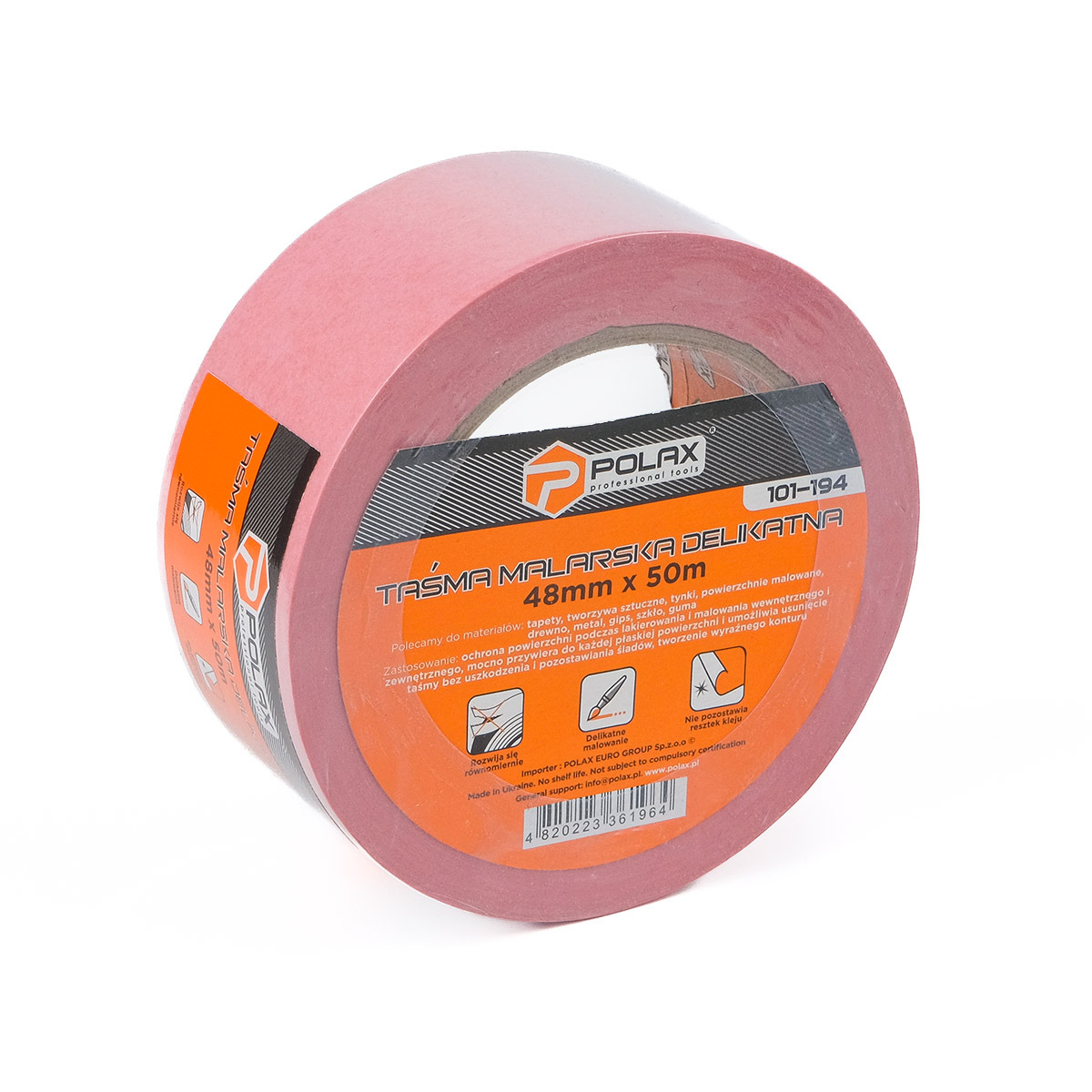 Malarska taśma 'Delikatna' w kolorze różowym wykonana jest z japońskiego papieru ryżowego Washi z warstwą kleju na bazie modyfikowanego akrylu, charakteryzującą się średnim poziomem adhezji (przyczepności). Umiarkowana lepkość taśmy pozwala na jej stosowanie na powierzchniach o fakturze i porowatości, nie uszkadzając ich integralności.