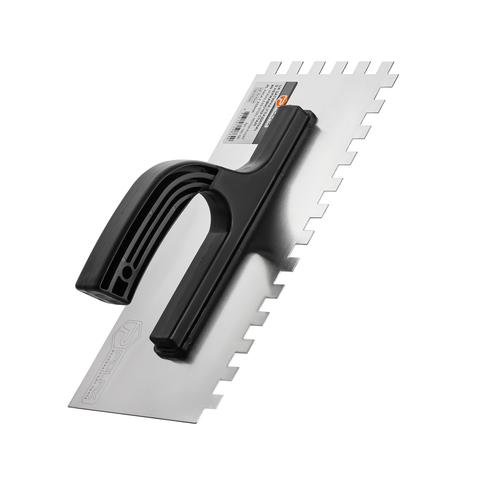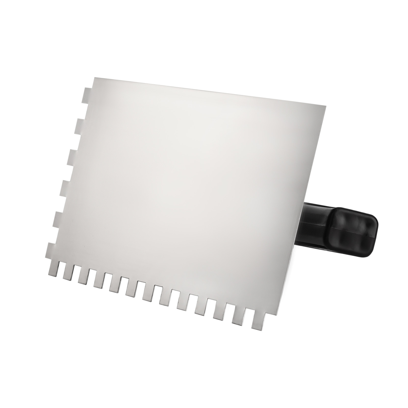 Profesjonalna szpachelka zębata przeznaczona do nakładania klejów podczas montażu płytek ceramicznych, płyt gipsowo-kartonowych oraz innych materiałów budowlanych. Idealnie sprawdzi się przy układaniu płytek o wymiarach do 30×30 cm i grubości od 10 mm wzwyż.
