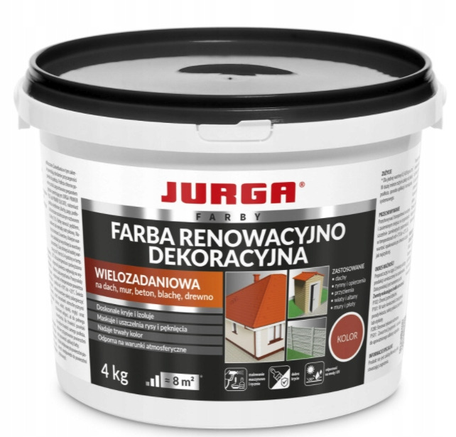 Wielozadaniowa Papa w płynie Jurga przeznaczona do odnawiania pionowych powierzchni takich jak mury, przyziemia ścian zewnętrznych budynku, dachy, opierzenia, elementy architektury ogrodowej: altany, domki i skrzynie na narzędzia, wiaty itp.