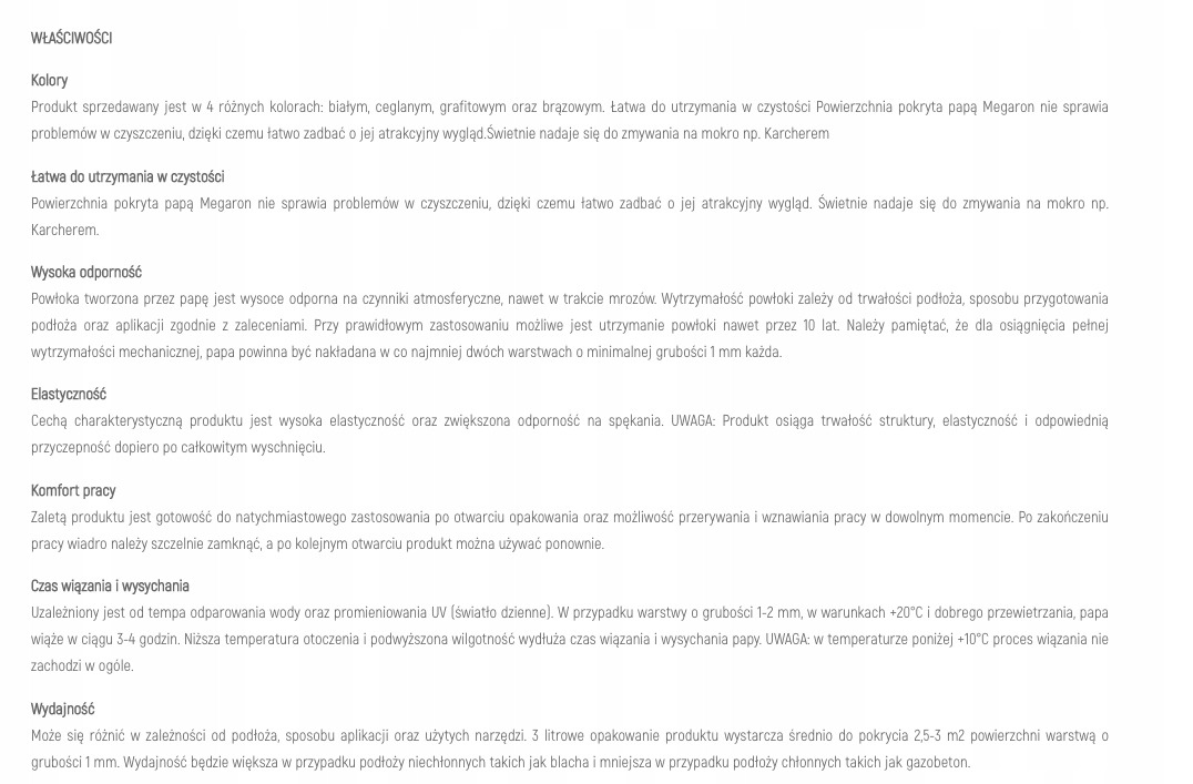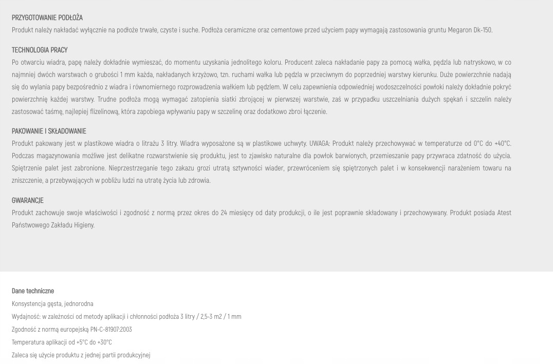 Produkt należy nakładać wyłącznie na podłoże trwałe, czyste i suche. Podłoża ceramiczne oraz cementowe przed użyciem papy wymagają zastosowania gruntu Megaron Dk-150.