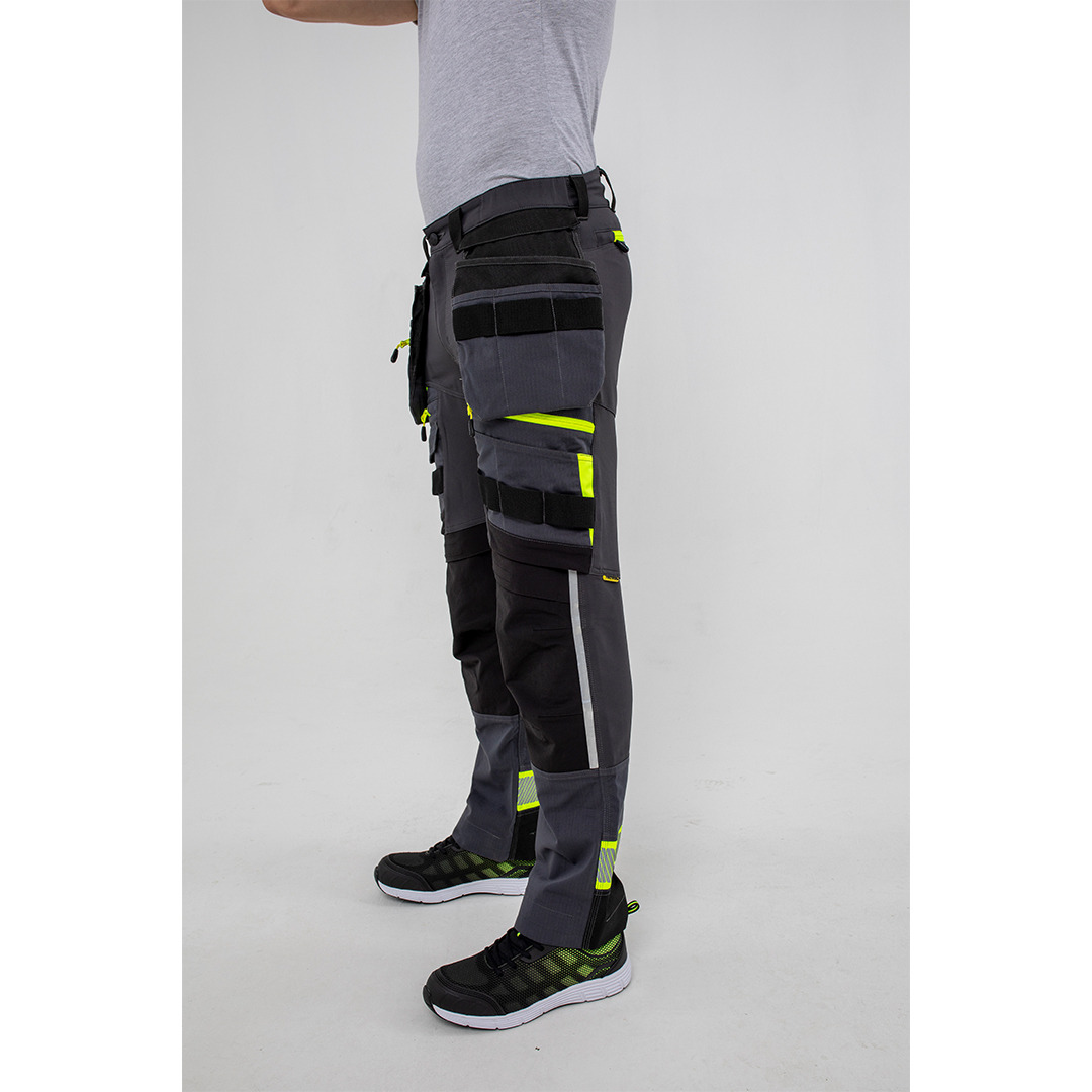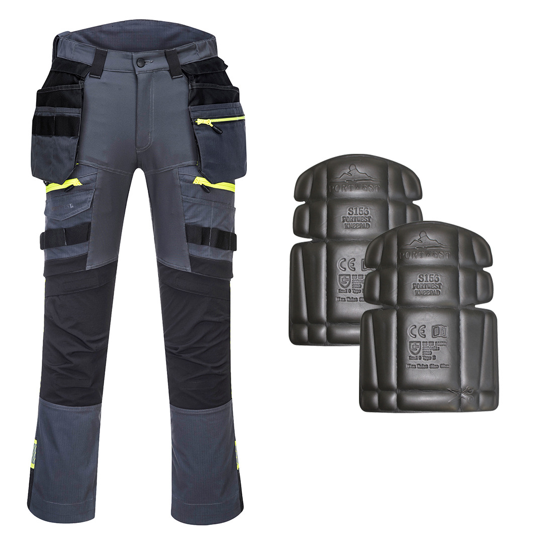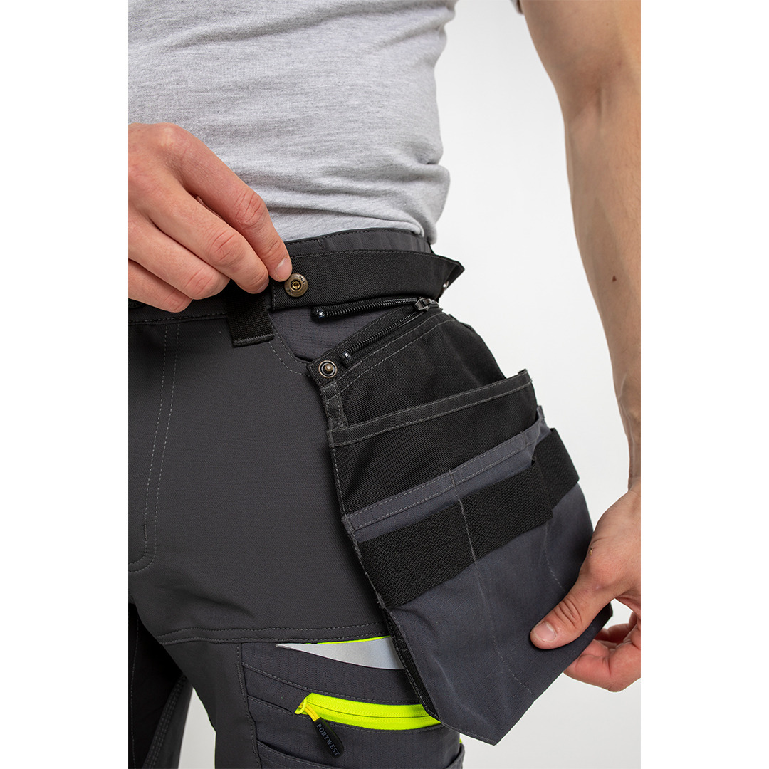 Spodnie z ODPINANYMI KIESZENIAMI KABUROWYMI DX4 są ergonomicznie zaprojektowane i wykorzystują dynamiczne rozciągliwe tkaniny STRETCH 4X, aby zapewnić maksymalny zakres ruchów podczas pracy. Spodnie posiadają wysoki stan w pasie z tyłu i są elastyczne z boku zapewniającą ochronę we wszystkich pozycjach roboczych. Wstępnie uformowane i ładowane od góry oraz regulowane kieszenie na nakolanniki, obszerne przednie kieszenie i wielofunkcyjne zapinane na zamek kieszenie na udach zapewniają bezpieczne przechowywanie. Potrójne szwy oferują najwyższą trwałość.