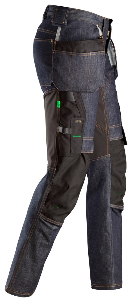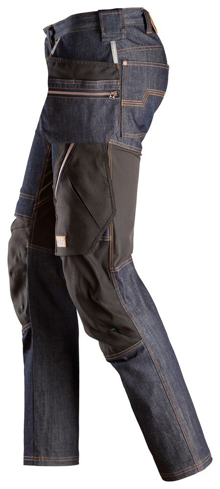 Dopasowane i elastyczne robocze spodnie jeansowe do intensywnych warunków pracy. Wytrzymała tkanina denimowa połączona z dopasowującymi się do kształtu ciała elastycznymi panelami zapewnia trwałość i łatwość poruszania się, a ochrona kolan potwierdzona certyfikatem EN14404 zapewnia niezawodną ochronę. Worki kieszeniowe umożliwiają wygodne przechowywanie wyposażenia. Wyposażone dodatkowo w uchwyty narzędziowe i kieszeń cargo z przegrodami zamykanymi na suwak.