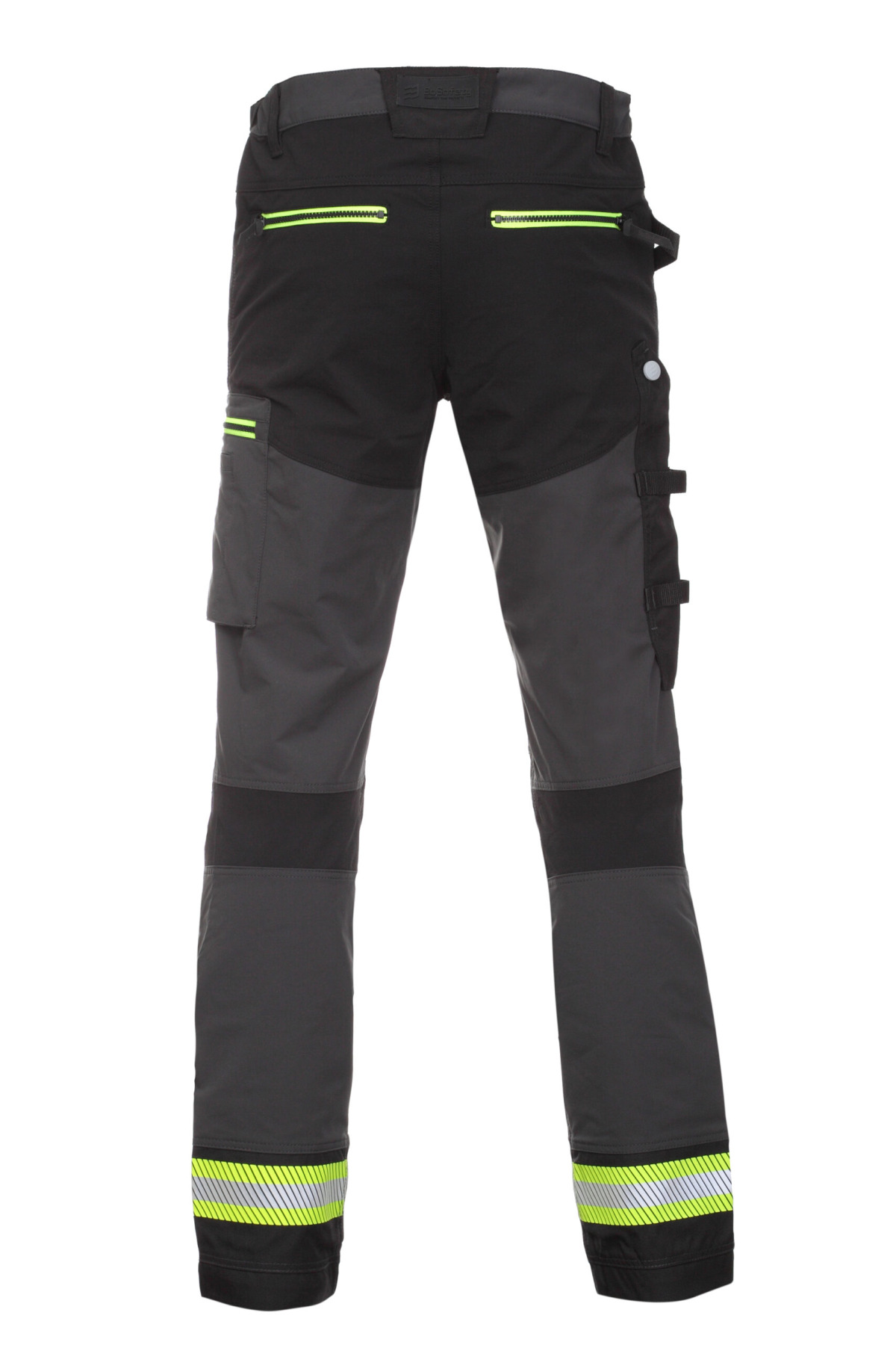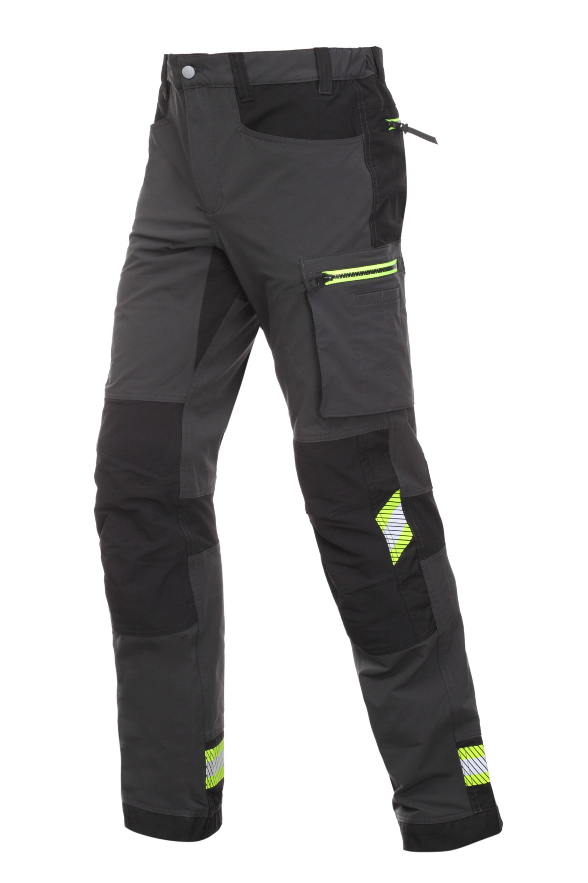Tkanina o splocie Dobby zapewnia doskonałą cyrkulację i przepuszczalność powietrza (Test odporności na parę wodną Ret = 2,8). Wysoka widoczność dzięki fluorescencyjnym wstawkom zgodnym z normą EN ISO 20471. W dolnej tylnej części spodni znajdują się również dwa segmentowe, nie ograniczające ruchów, taśmowane paski odblaskowe.