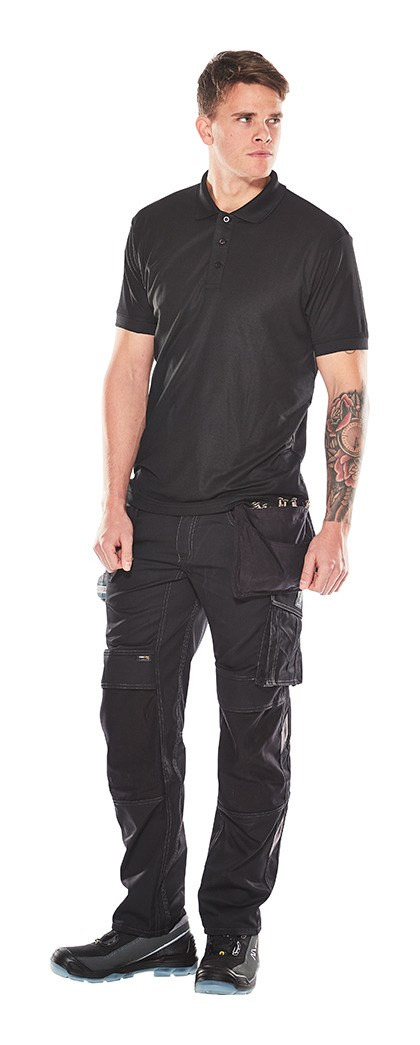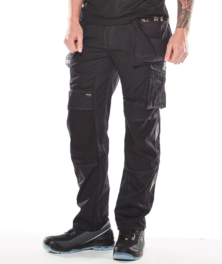 - Kieszenie na kolanach wzmocnione tkaniną CORDURA®, z wejściem od góry na nakolanniki oraz klapką, dzięki czemu nie gromadzi się brud.