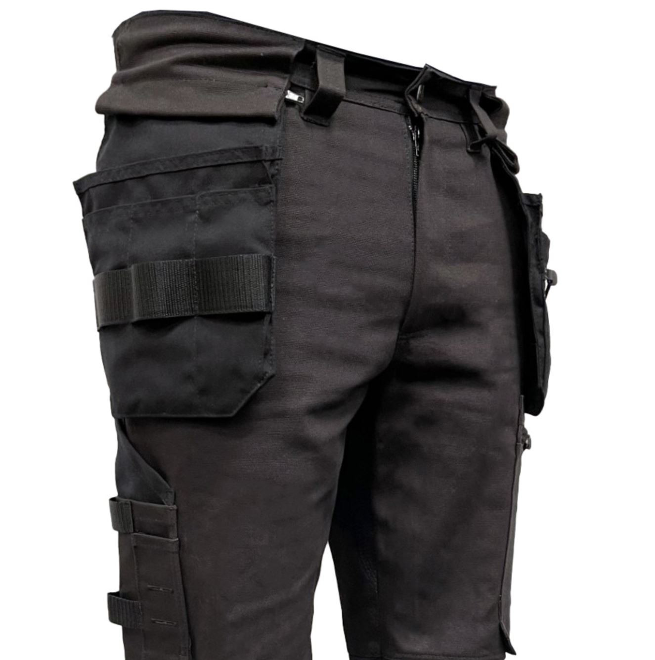 - Praktyczne kieszenie – po obu stronach spodni (w okolicy bioder) znajdują się głębokie kieszenie wpuszczane. Po prawej stronie łydki znajduje się kieszeń na narzędzia, a po lewej kieszeń zapinana na suwak.