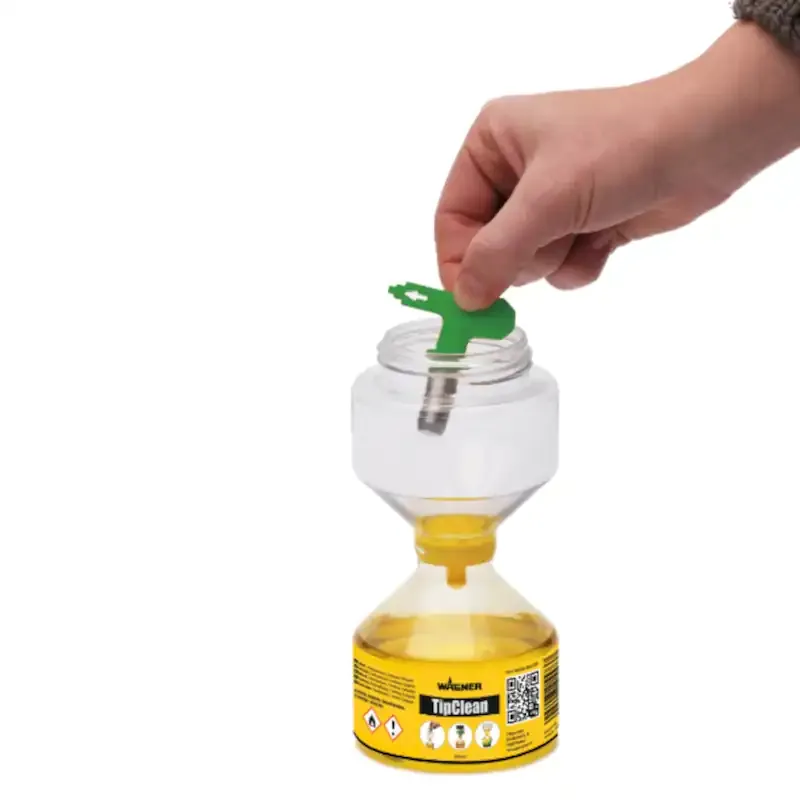 Klepsydra TipClean to pojemnik do czyszczenia i konserwacji dysz malarskich. Wypełniona płynem czyszczącym, pozwala na dokładne, bezdotykowe usunięcie resztek materiału i zabezpieczenie dysz przed wysychaniem.