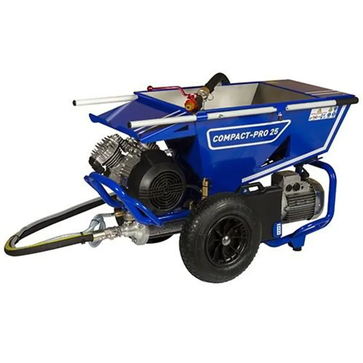 Euromair Compact-Pro 25 to ślimakowy agregat do systemów dociepleń z wbudowanym kompresorem jednocylindrowym. Urządzenie idealne do nanoszenia tynków, zapraw i tapet natryskowych, wyposażone w pełną regulację obrotów pompy ślimakowej, co pozwala na aplikację różnorodnych tynków strukturalnych. Łatwa obsługa i transport czynią go idealnym do małych prac na elewacjach.