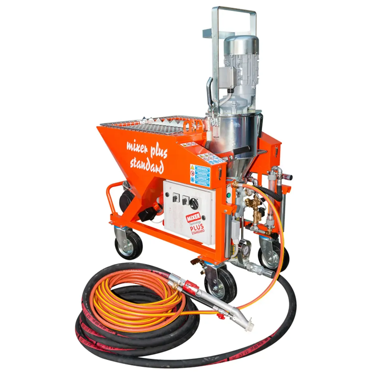 Mixer Plus Standard to trójfazowa pompa o napięciu 400 V, idealna do pracy ciągłej. Urządzenie doskonale sprawdza się przy natryskiwaniu wstępnie zmieszanych powłok powierzchniowych, takich jak wapno, cement, środki wykańczające, kleje, wylewki samopoziomujące i inne produkty mechaniczne. Model standardowy posiada elektromechaniczny pulpit operatora, który nie zawiera komponentów elektronicznych, co czyni go wyjątkowo niezawodnym na dużych placach budowy.