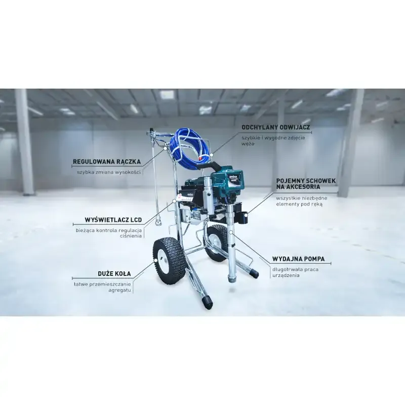 - Wysoka wydajność: Przepływ farby na poziomie 2,4 l/min oraz maksymalne ciśnienie 210 BAR pozwalają na szybkie i precyzyjne malowanie dużych powierzchni.