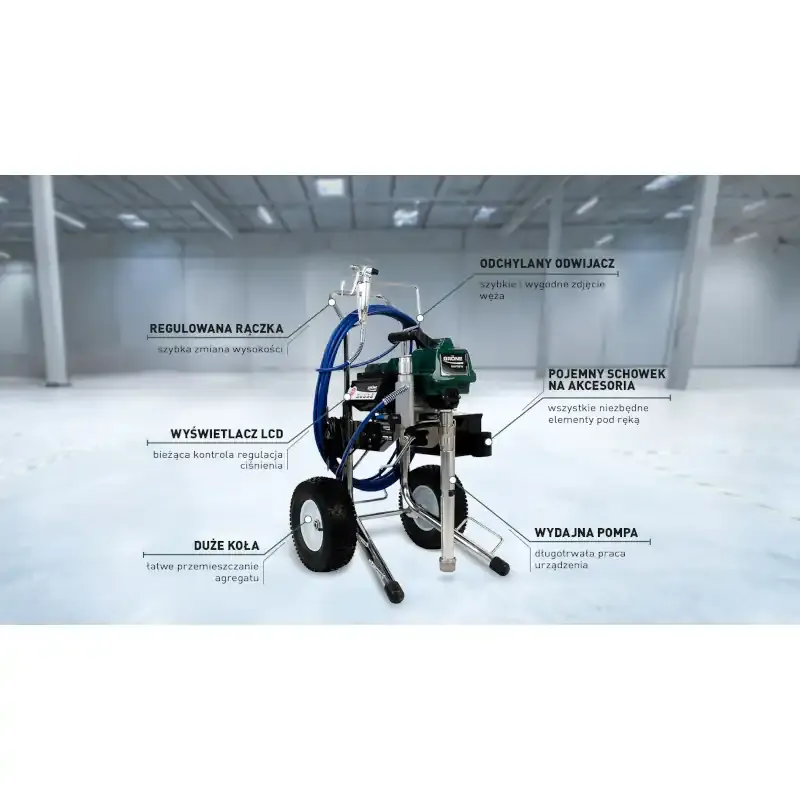 - Wysoka wydajność: Przepływ farby 2,0 l/min oraz maksymalne ciśnienie 210 BAR zapewniają precyzyjne i równomierne krycie powierzchni.