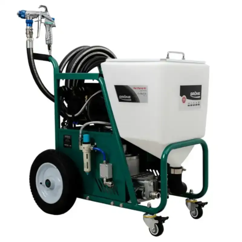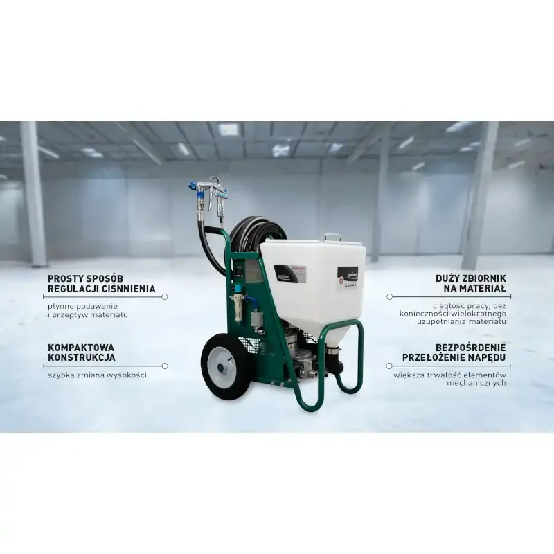 Agregat tynkarski HardSpray 80 marki GRÖNE to urządzenie zaprojektowane z myślą o najbardziej wymagających zadaniach tynkarskich. Wyposażony w wbudowany kompresor, agregat zapewnia precyzyjne i równomierne nakładanie tynków strukturalnych, silikonowych, silikatowych oraz gładzi. Dzięki solidnej konstrukcji i zaawansowanej technologii jest idealnym wyborem dla profesjonalistów.
