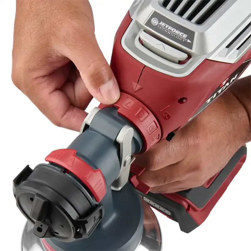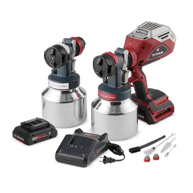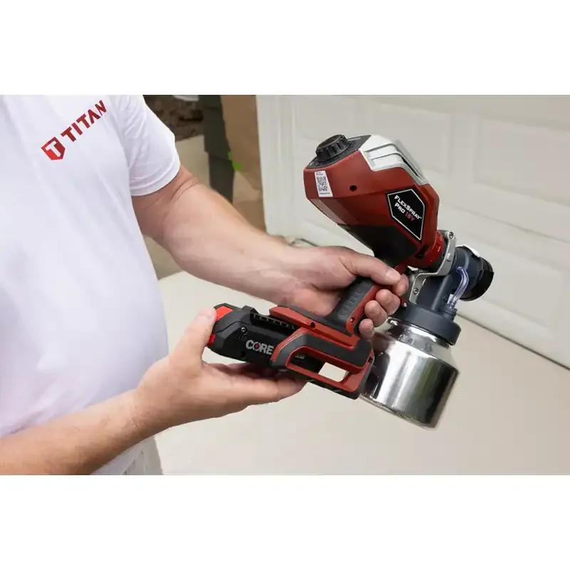 FlexSpray Pro 18V marki Titan to zaawansowany technologicznie, bezprzewodowy system malarski, stworzony z myślą o profesjonalistach. Wyposażony w technologię JetForce oraz innowacyjny system wymiennych końcówek FlexFinish i FineFinish, urządzenie zapewnia wydajność natrysku bezpowietrznego i precyzję HVLP w jednym kompaktowym narzędziu. Dzięki zasilaniu na baterie AMPShare by Bosch, FlexSpray Pro 18V oferuje pełną mobilność i niezależność od źródeł zasilania.