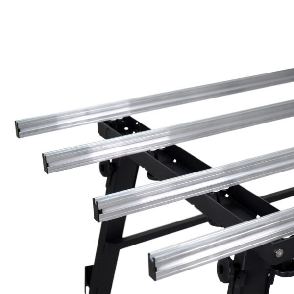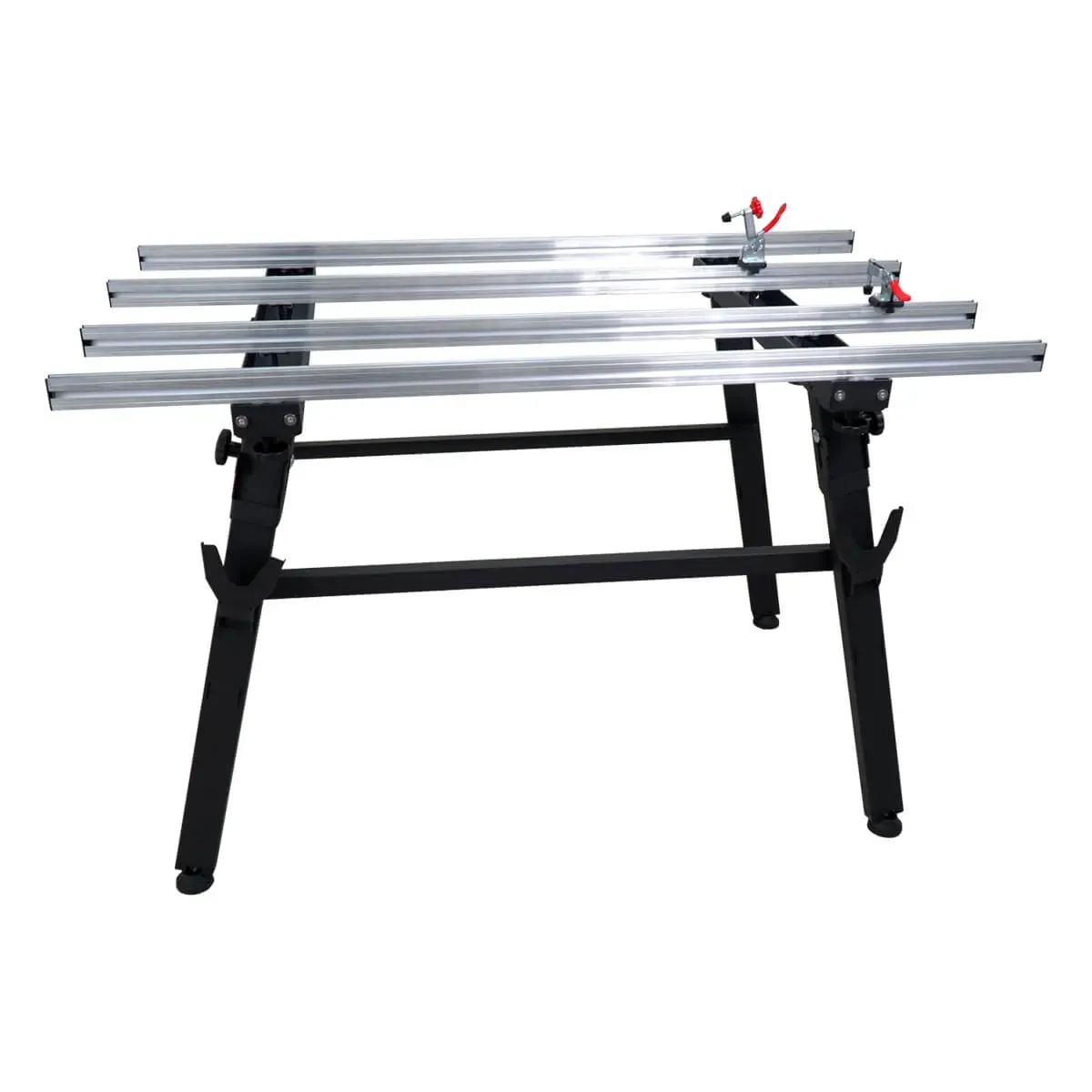 Zaciski magnetyczne zwiększają ergonomię przechowywania narzędzi, a dodatkowe nawiasy umożliwiają ustawienie reguły, poziomu itp. w dogodnej pozycji. Nogi stołu wyposażone są w podpórki na zawiasach, które zapewniają bezpieczną pozycję stołu.
