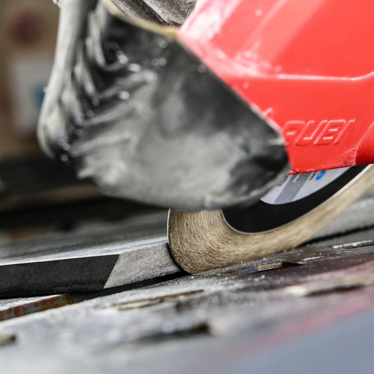 Tarcza Distar Edge rozwiązuje te problemy. Została stworzona specjalnie do cięcia ceramiki pod kątem 45 stopni, oferując wyjątkową stabilność i precyzję. Warstwa diamentowa tarczy posiada kanapkową konstrukcję, z szerokimi bocznymi warstwami diamentowymi o wysokości 25 mm z drobnego ziarna, które delikatnie szlifują krawędź i zapewniają dodatkowe zbrojenie. Wewnętrzna warstwa o wysokości 8 mm z grubszym diamentem gwarantuje szybkie i efektywne cięcie.
