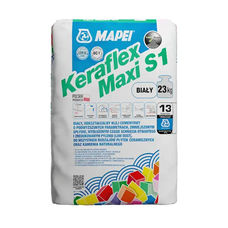 KERAFLEX MAXI S1 to odkształcalny klej cementowy o podwyższonych parametrach i zredukowanym pyleniu. Idealny do montażu płytek ceramicznych i kamienia naturalnego, w tym dużych i ciężkich płyt w trudnych warunkach eksploatacyjnych.