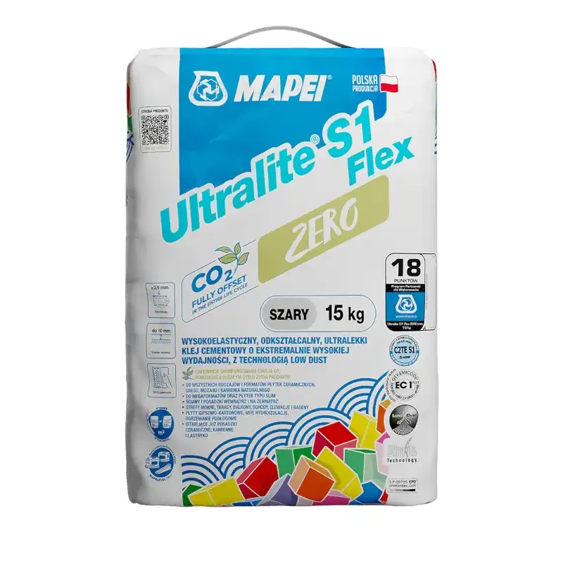 ULTRALITE S1 FLEX ZERO to innowacyjny klej cementowy marki MAPEI, który wyróżnia się wysoką elastycznością, odkształcalnością oraz doskonałą wydajnością. Dzięki zastosowaniu technologii ULTRALITE™ i LOW DUST, klej jest łatwy w aplikacji, minimalizuje emisję pyłu i zapewnia maksymalny komfort pracy. Idealny do montażu każdego rodzaju płytek ceramicznych, gresu i kamienia naturalnego – od standardowych formatów po megaformaty oraz płytki typu slim.